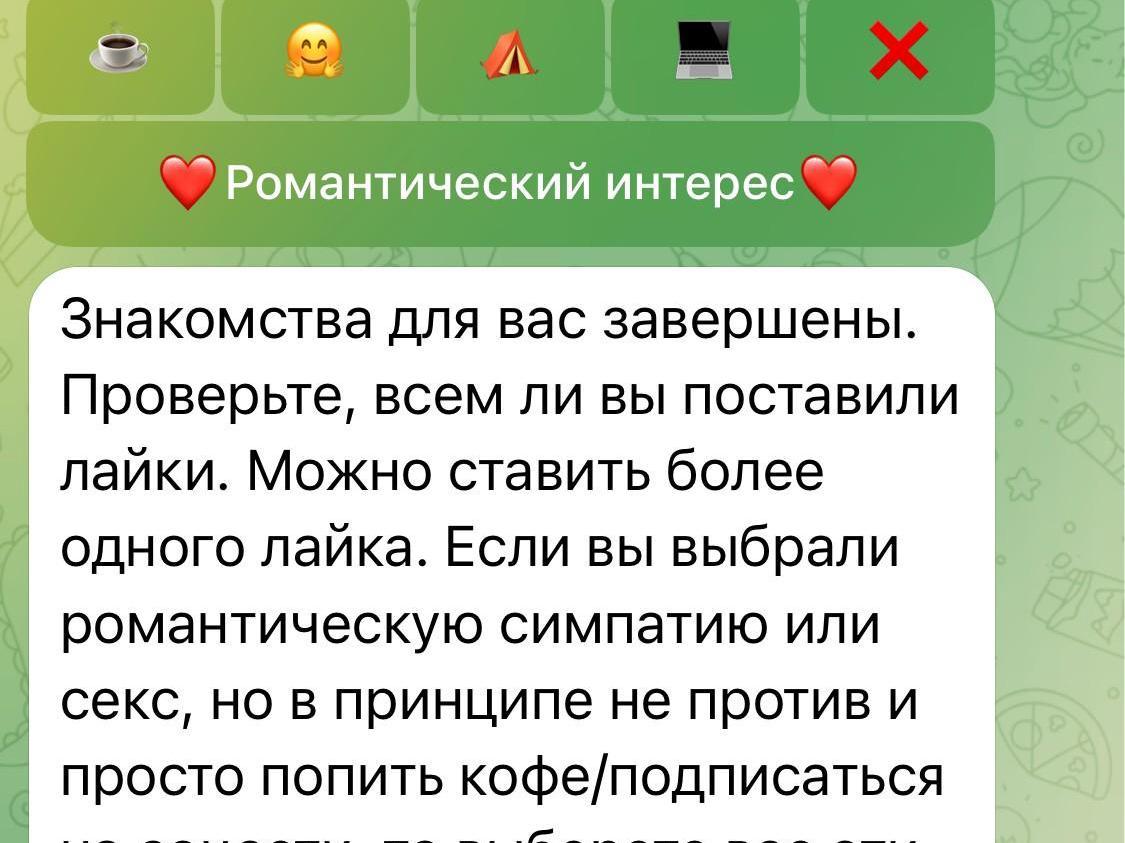 By the end of the introductions, Ivetta had seven pairs and Andrei had six. Each conversation lasted 11 minutes. When time ran out, a message arrived in the bot with a survey: would you like to meet up, follow each other on social media, go on a date, or have a cuddle. There was also a very honest option — purely sexual interest.