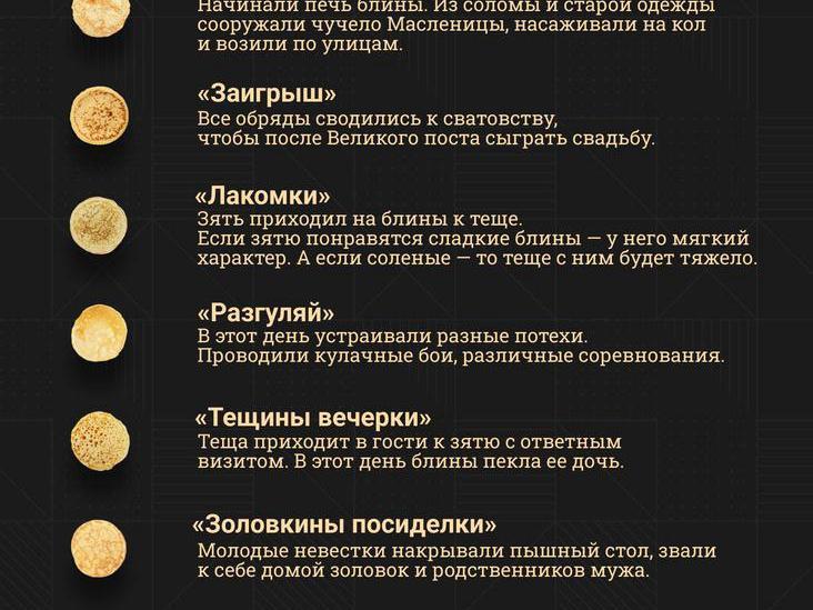 Each day of Maslenitsa week has its own name and traditions. They are shown in one picture.
