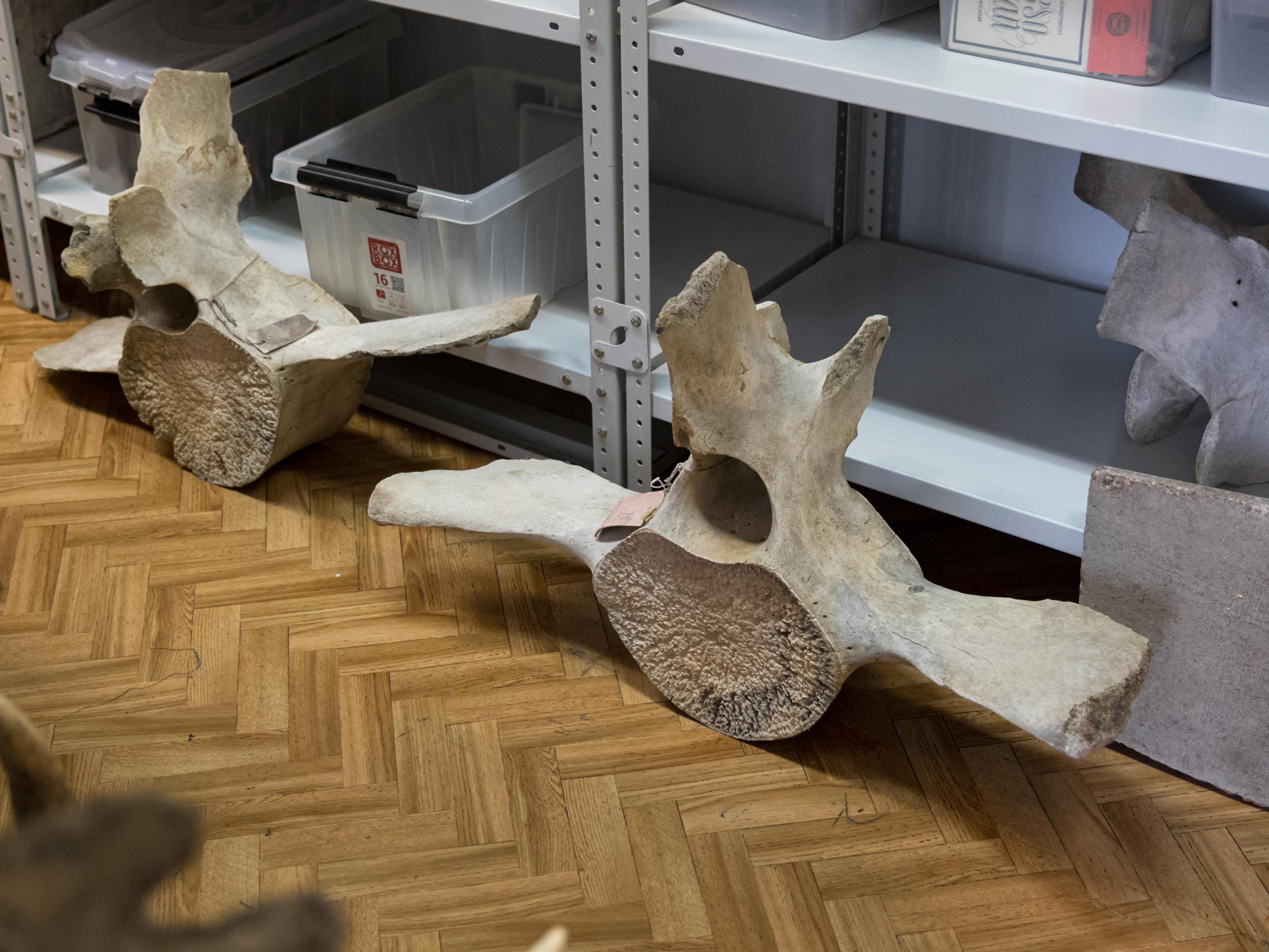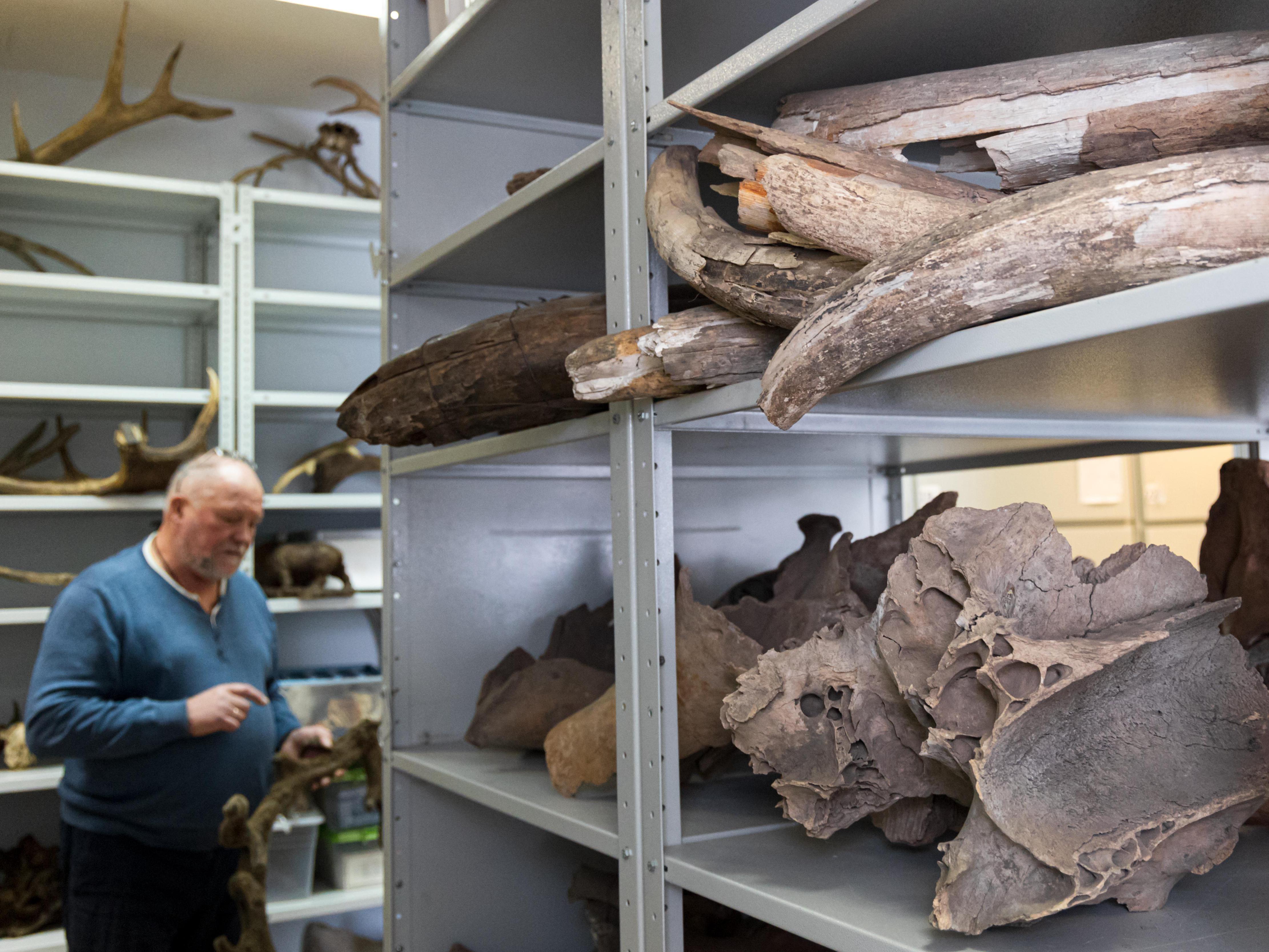 We go up to the second floor. Boxes, crates, bones, tusks, fossilized teeth. Neatly stacked, as if they aren«t tens of thousands of years old.