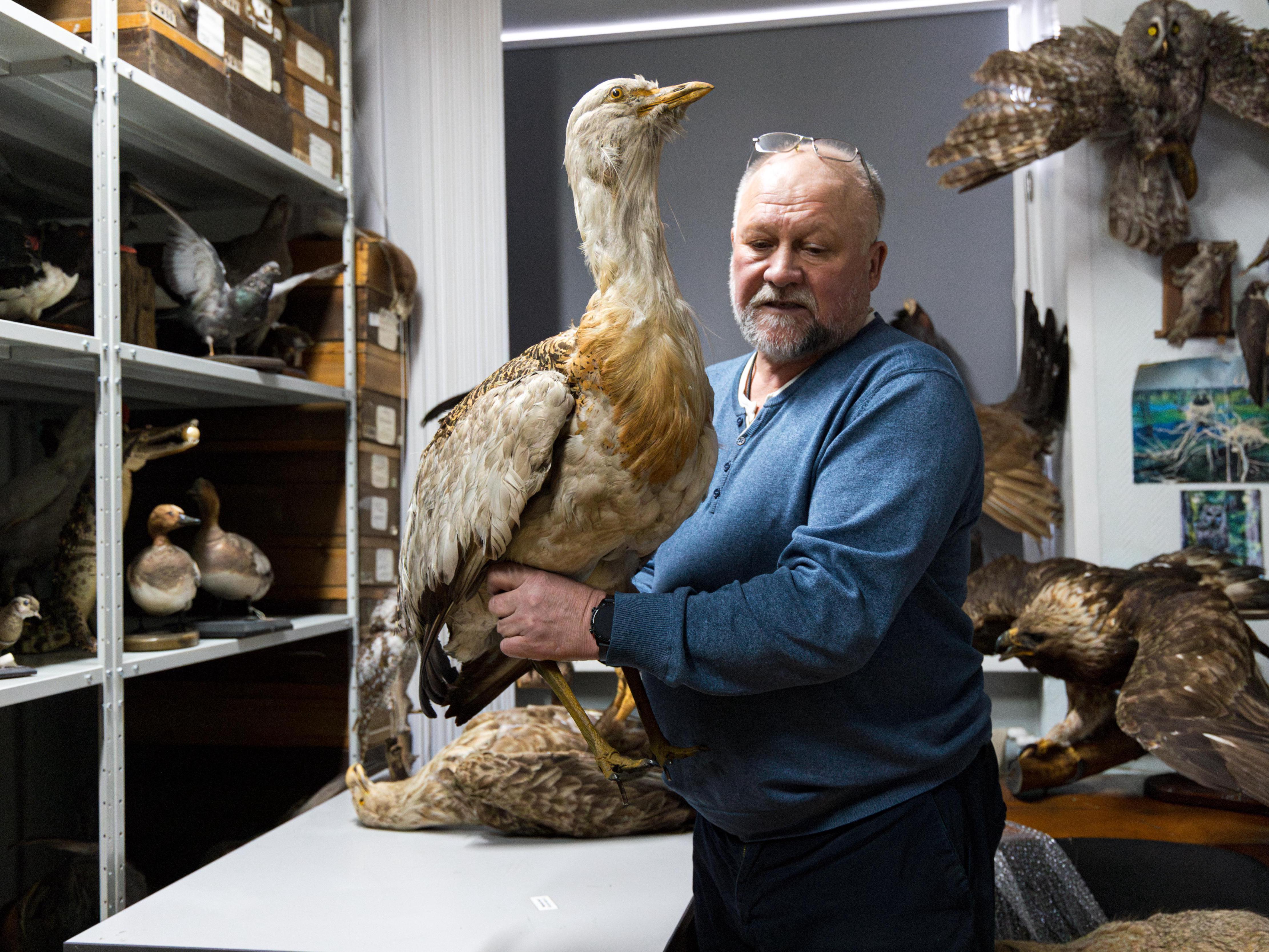 — Here we have a great bustard. It used to inhabit the Minusinsk Basin, now it remains only in Tuva and even then — in single numbers. The last time I saw it was on the border with Mongolia. This is the largest flying bird in the fauna of Russia. Its weight reaches, probably, 16 kilograms (about 35 pounds).