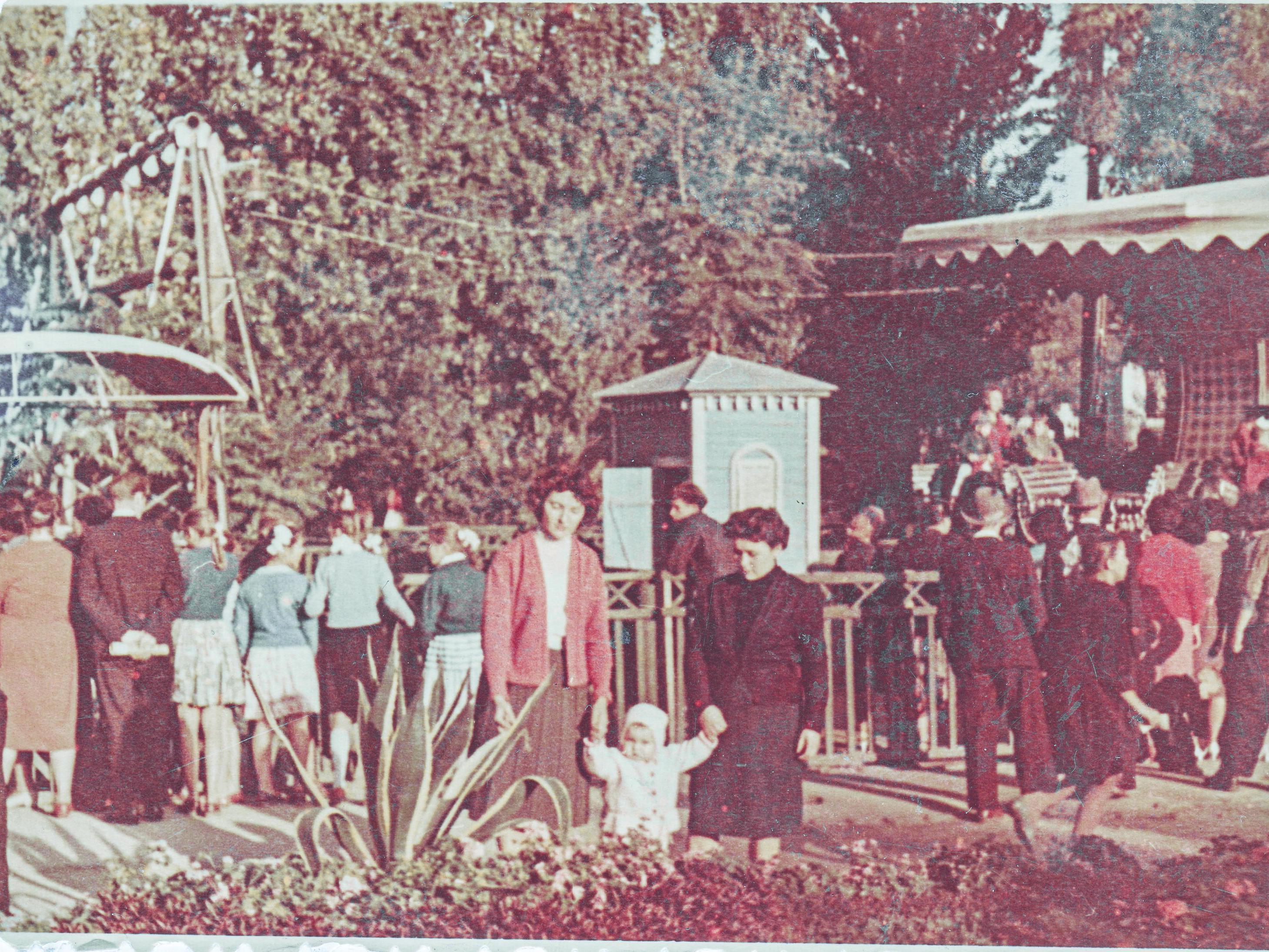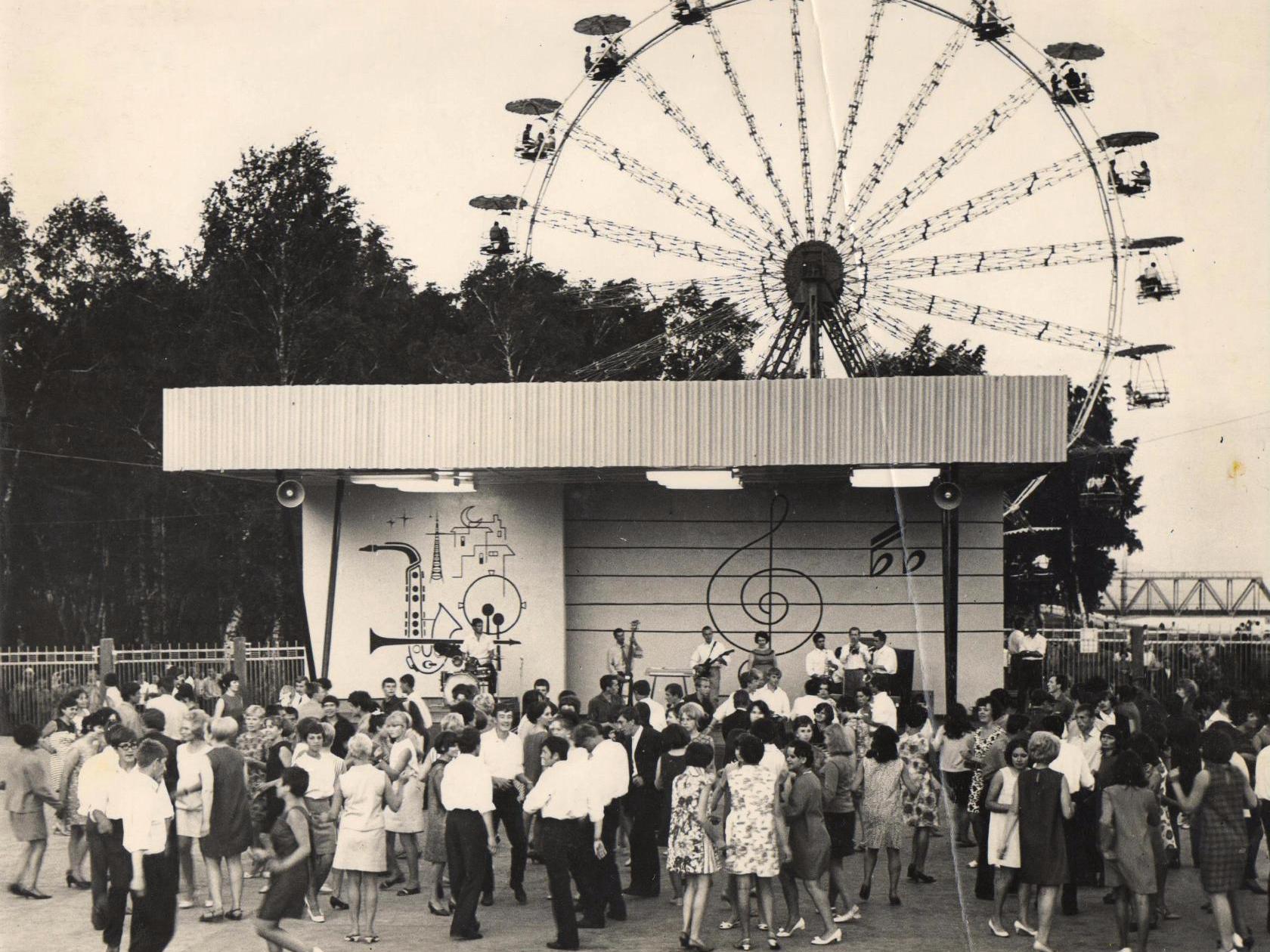 Here is a dance floor at the end of the Kirov Embankment, with musicians from the Kirov House of Culture playing on stage. In the background is a Ferris wheel, and on the right is a railway bridge leading to «KhimProm». A trend toward shorter skirts and dresses among Soviet women is already noticeable, as it«s the 1970s.