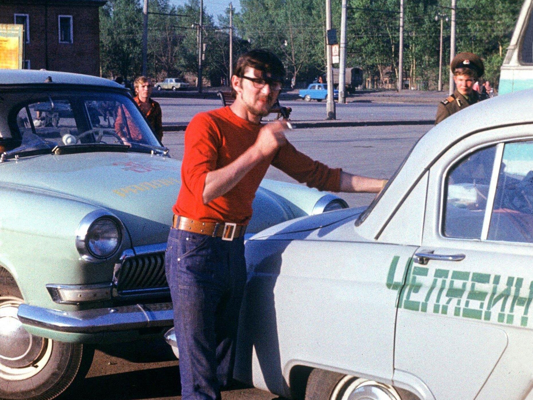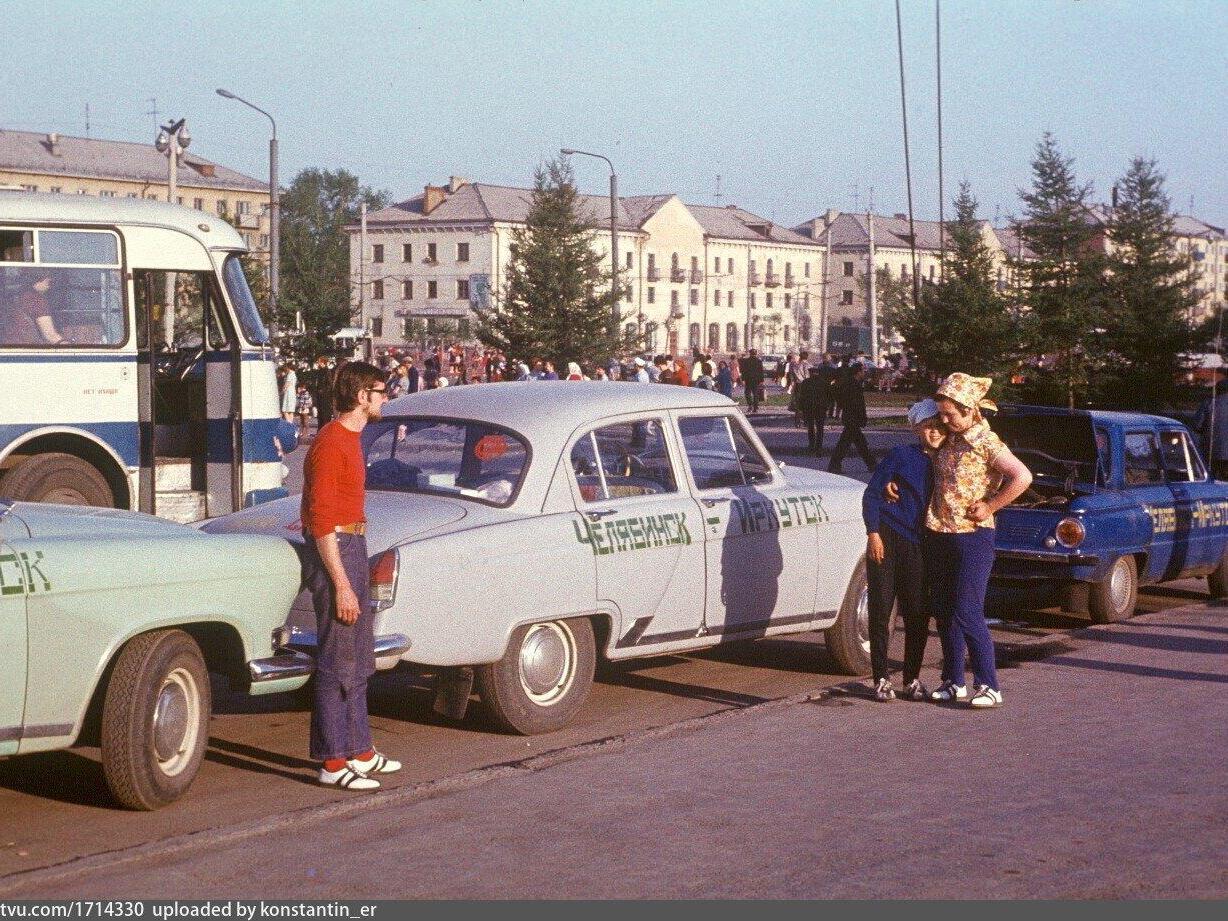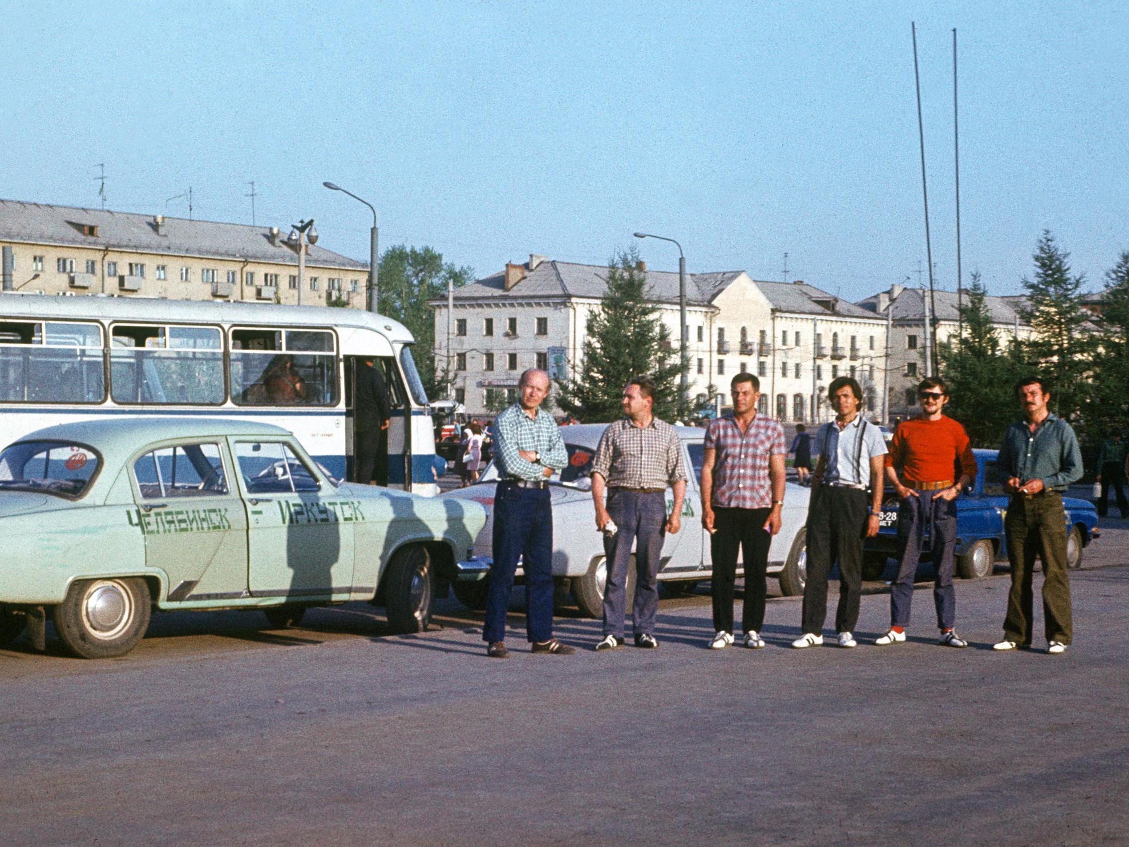 This is also 1975. For the first time in archival photos, women from Kemerovo appear in trousers. Participants of the «Chelyabinsk–Irkutsk» rally on the station square.