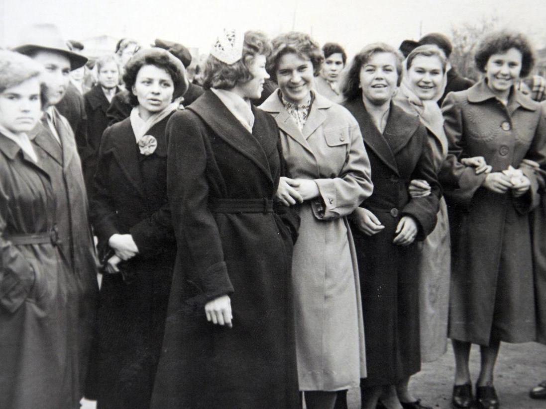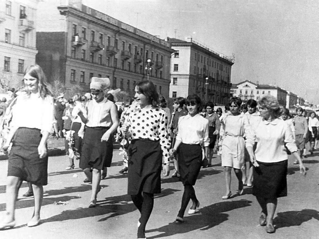 This photo was taken a year later, in 1967. Women from Kemerovo headed to the May Day demonstration. The column of School No. 8 marches along Sovetsky Prospekt. In those days, it was customary to wear the best, festive clothes to demonstrations. They were saved for special occasions—«for going out».