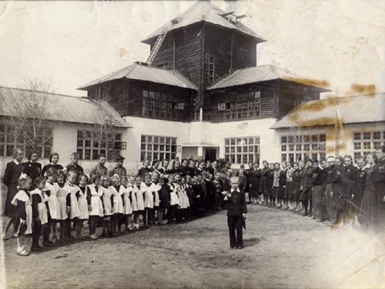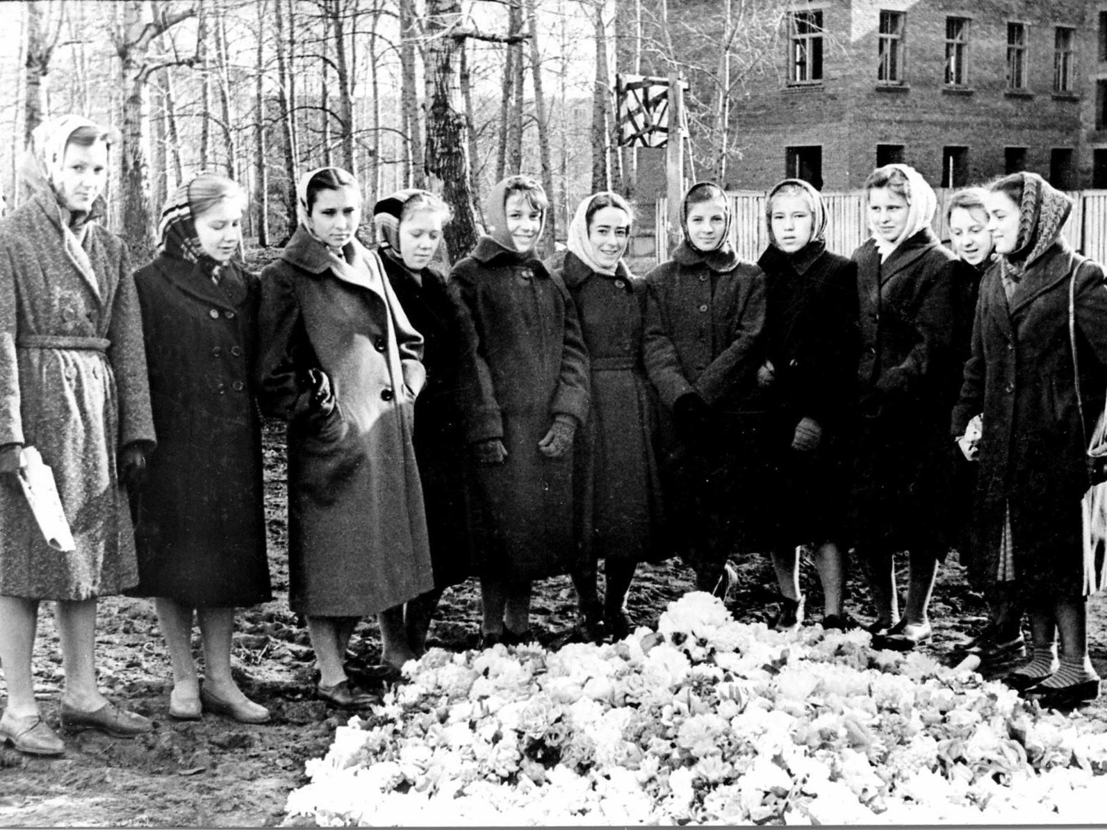 The next photo was taken in the yard of School No. 4 in the 1960s. Teachers or senior schoolgirls look identical: most in dark-toned coats, all without exception in headscarves.