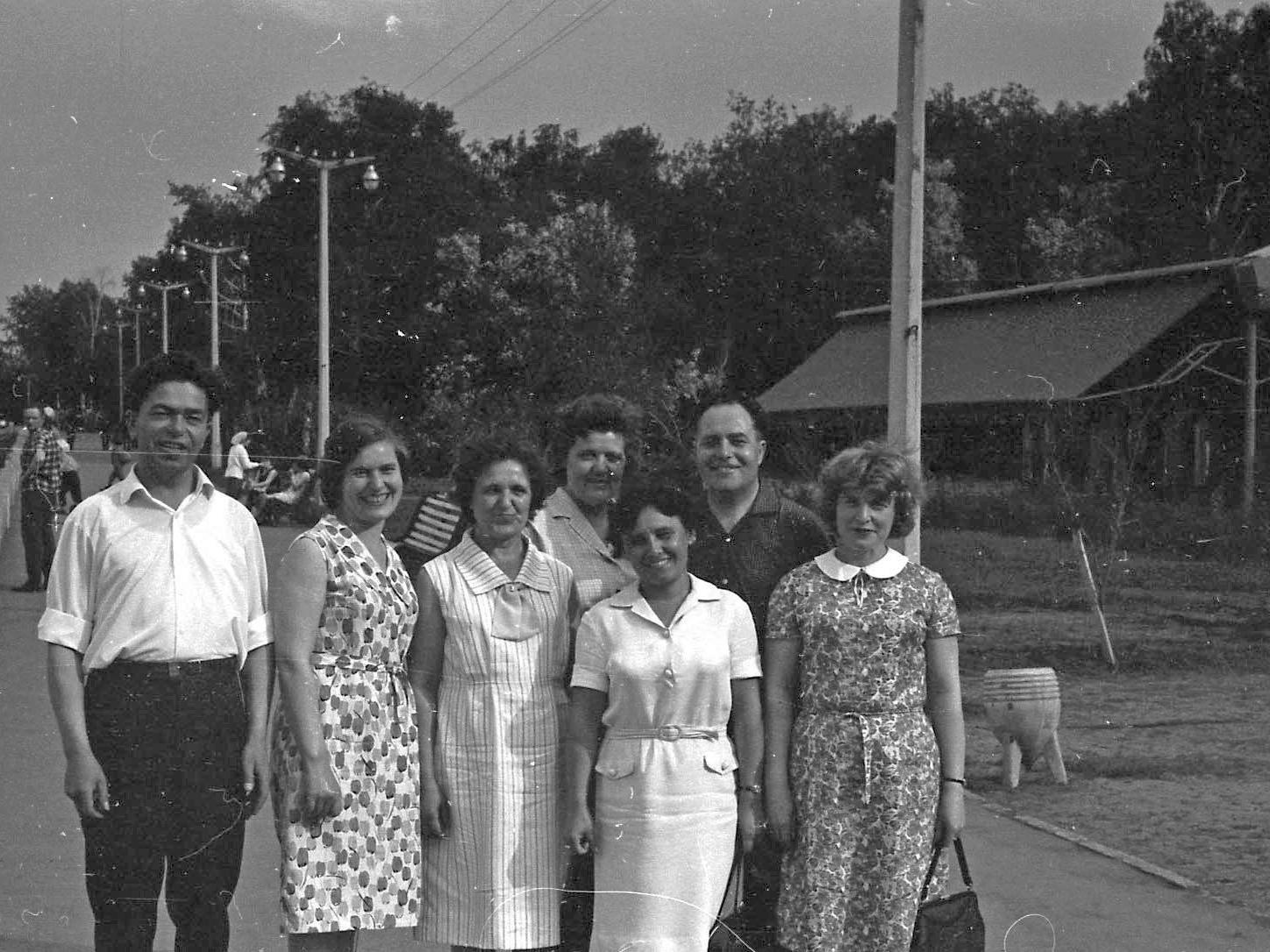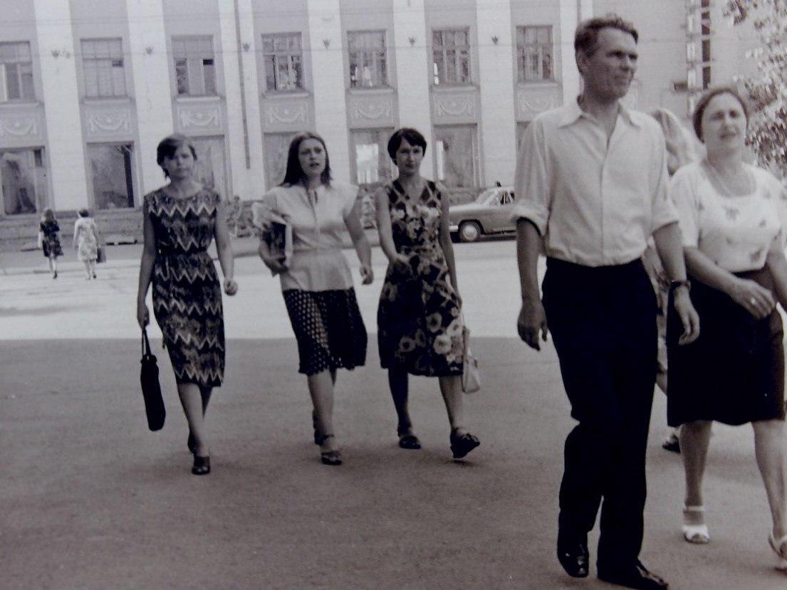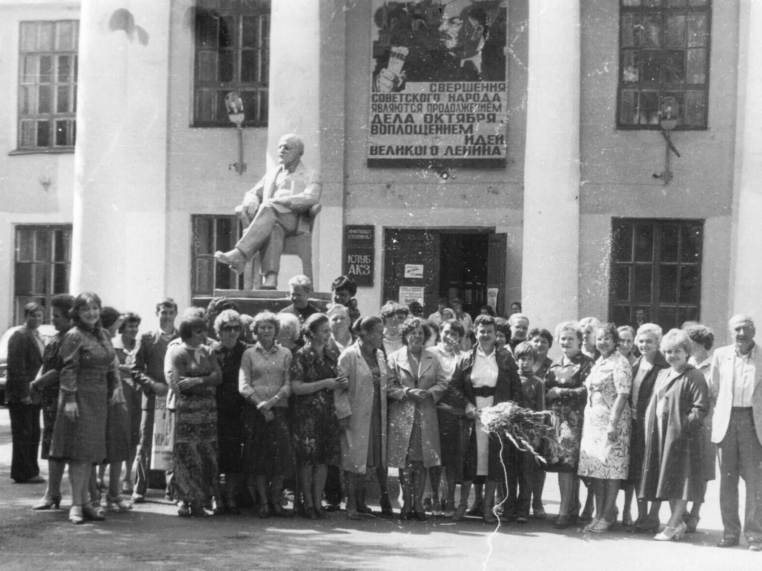 This is how the older generation dressed at the turn of the 1980s. In the photo—workers of the aniline dye plant, along with them a composer and a poet (the composer stands with a bouquet of flowers in the middle, and the poet is on the far right).