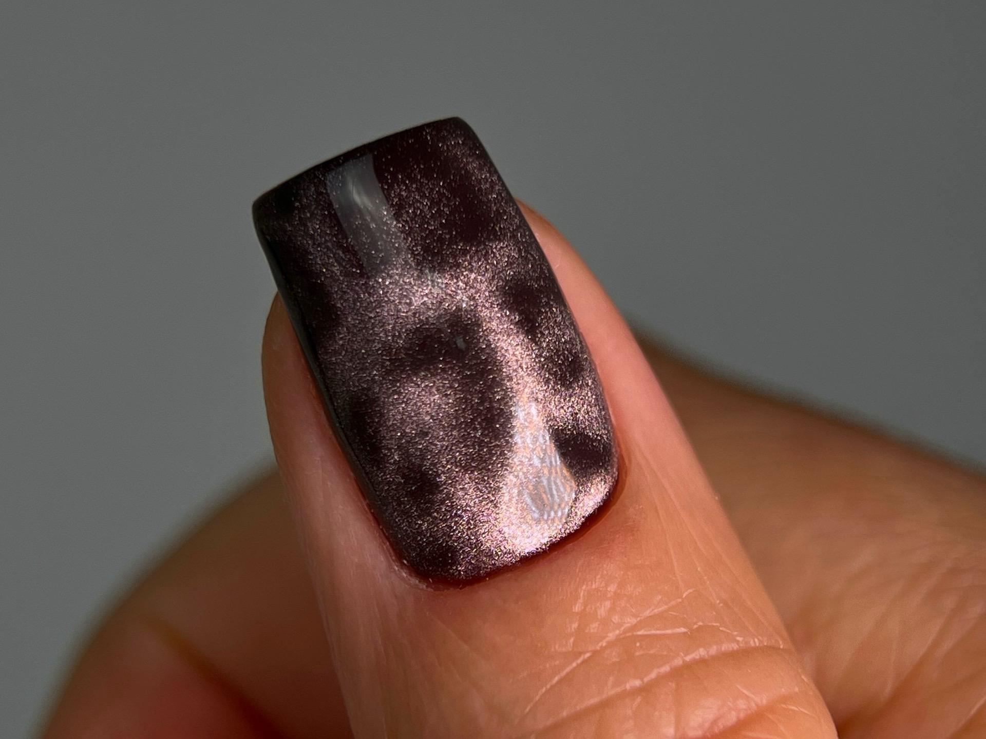 «Velvet-glass» nails — another trend that will look great on the soft square shape. The cat«s eye effect isn»t new, but for a long time, the magnet was placed to create a vertical pattern. In 2025, Korea changed the game, and horizontal became fashionable.