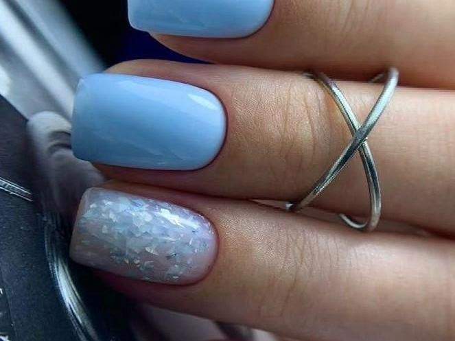 Last year, the nail world was captured by the «butter» color trend. This year, it has been replaced by sky blue. With it, you can do both solid coverage and elegant French.