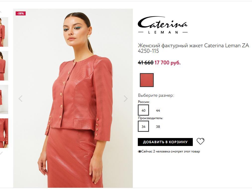 Previously, such a jacket cost 60,000 rubles (about $670 at current rates). Now it can be taken for 18,000 rubles (about $200 at current rates) with a discount. The skirt from the suit will cost less — only 9,000 rubles (about $100 at current rates). And before the markdown, it was sold for 32,000 rubles (about $360 at current rates). The models were developed in Switzerland, the fabric composition is almost half viscose and cotton.