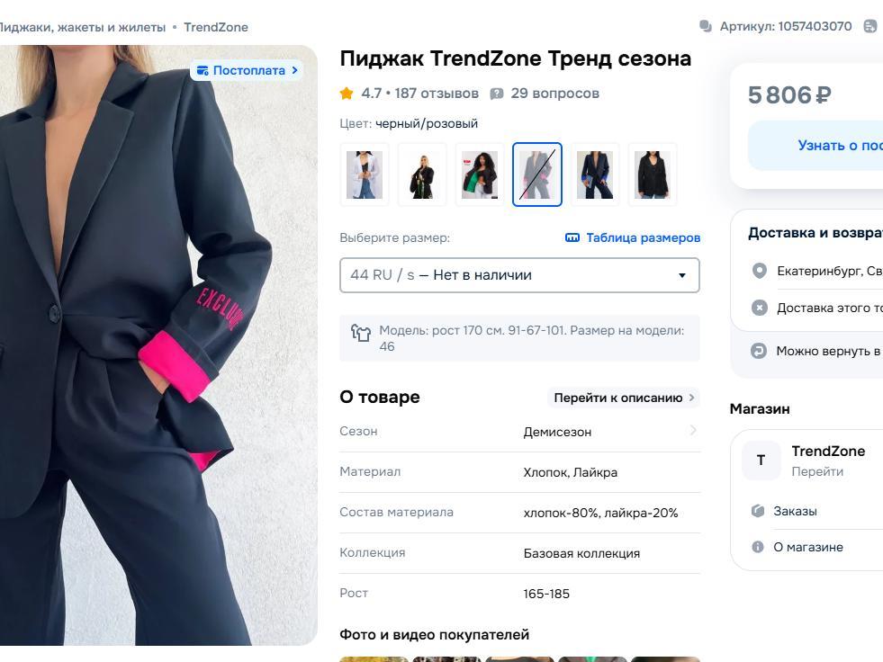 If we cannot state anything about the T-shirt and jacket, we can confidently tell about the blazer in which Tatyana Savinova traveled to children«s camps in the Sverdlovsk region: it was ordered on a marketplace. They are no longer in stock, but its last price was recorded: 5,800 rubles (about $64 at current rates).