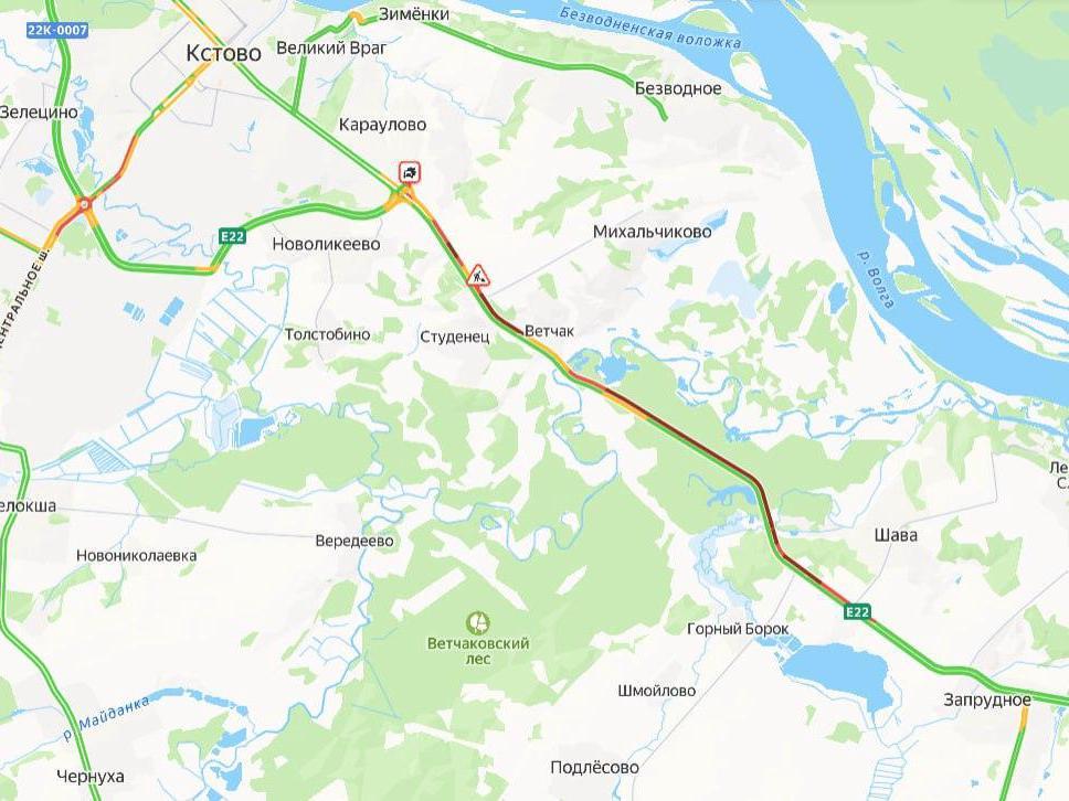 Due to the traffic jam, it is now difficult to approach Kstov. The jam stretches from the village of Zaprudnoye to Magistralnaya Street in the city. In addition to roadworks, a traffic accident has also occurred on this section.
