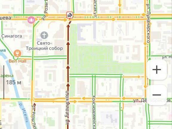 Yandex Maps displays extensive traffic delays on Belinsky Street following the tram and car collision.