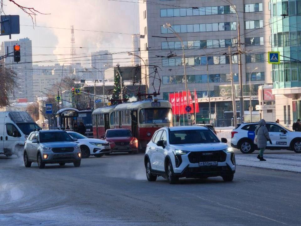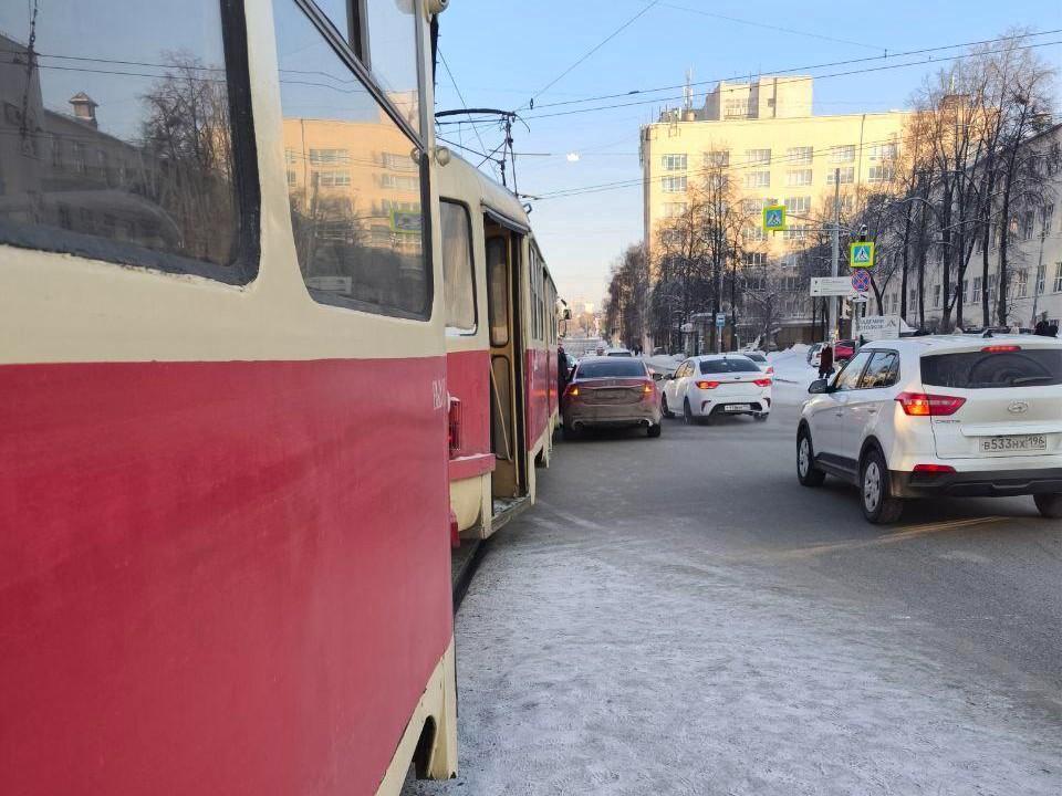 A road traffic accident at the intersection of Kuybyshev and Belinsky streets in Yekaterinburg led to a collision between a tram and a red passenger car. Passage through this area has become virtually impossible.
