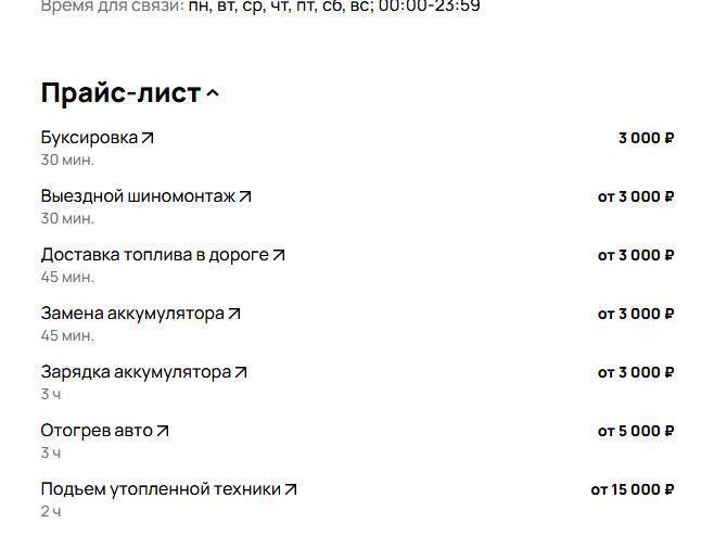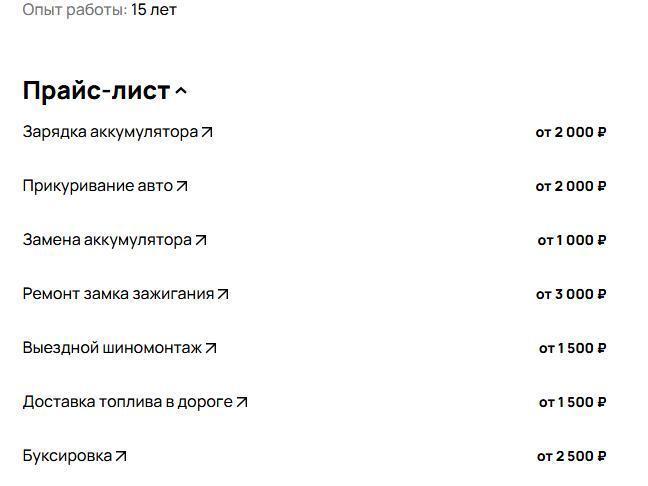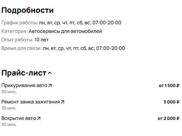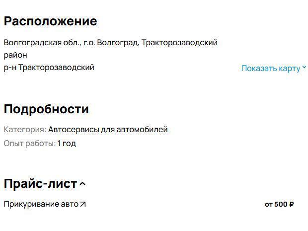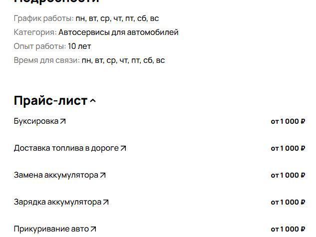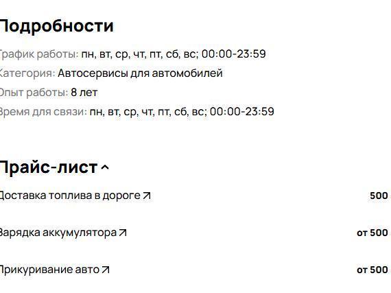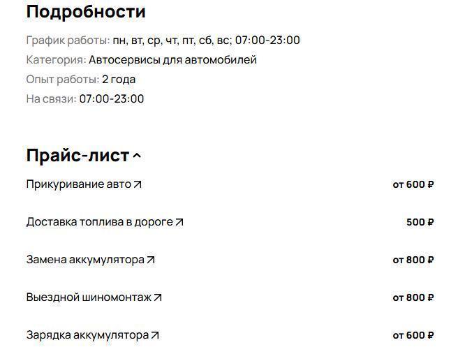 The same offer details: «In my work, I use only high-quality European jump-starting devices that are safe for your cars. The »jump-start« service price in the ad is for a non-commercial passenger car with a gasoline internal combustion engine, depending on distance; outside the city, the price is negotiated individually. If, after connecting the booster, the starter turns (as we have essentially connected an external power source), the service is considered rendered, and accordingly, the call-out is paid at the agreed cost.»
