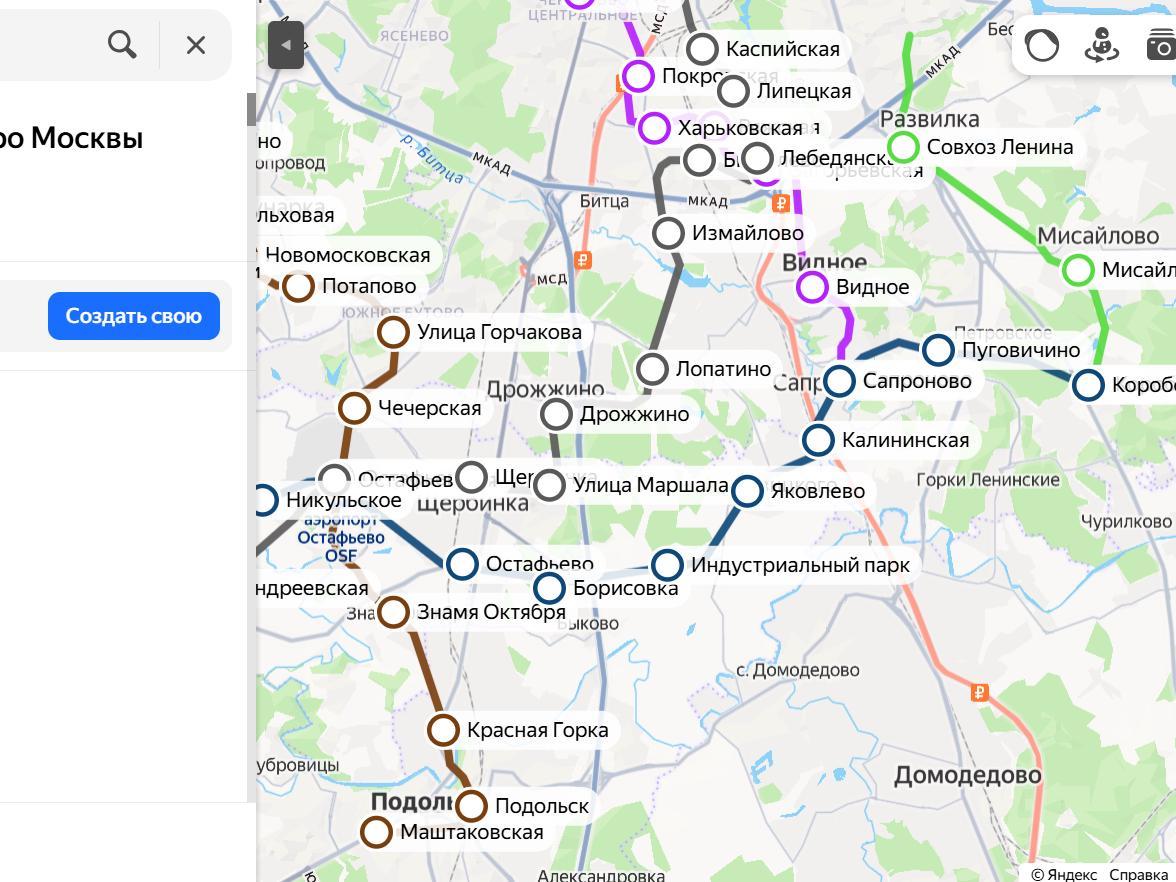 The Biriulyovo line will officially be extended from «Biriulyovo» through Shcherbinka to Kievskoye Highway. However, there are rumors that the section from «Ostafyevo» to the terminus in New Moscow will be allocated to the Rokadnaya (Bypass) line. Suppose that«s the case. Extend our rocade from Ostafyevo to the Moscow region, connect it with Vidnoye and the vicinity of Misaylovo. An underground (and free!) duplicate of the »YULA« highway is ready.