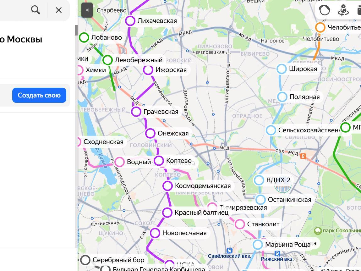 Turn through the center to «Barrikadnaya» towards Botkinskaya Hospital and the BKL station «CSKA». And further – only towards Koptevo, where there is no metro. Then through Onezhskaya Street, MCC «Grachevskaya», and Izhorskaya Street straight to the MKAD (Moscow Ring Road). Let«s not forget about the Moscow region – we»ll compliment Dolgoprudny, and from there it«s not far to Sheremetyevo Airport.