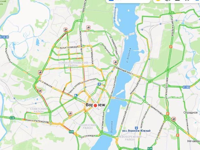 Yandex Maps data indicates widespread traffic incidents and high congestion levels in Voronezh following the ice rain.
