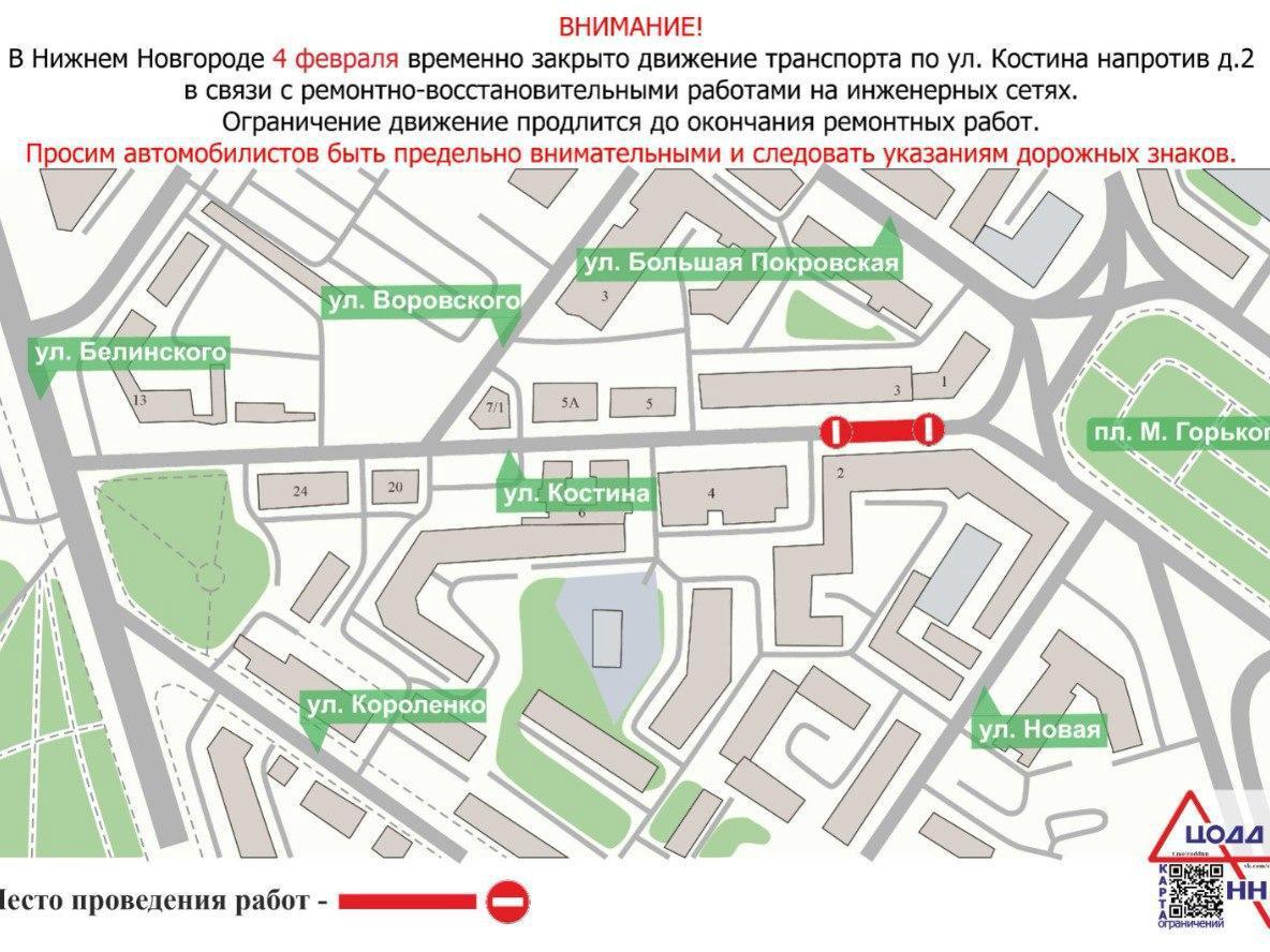 A busy street in central Nizhny Novgorod, Kostina Street, which connects Belinsky Street and Gorky Square, has been closed indefinitely. The restriction is in effect near the historic building of the Aviation Technical School, the city administration reports.
