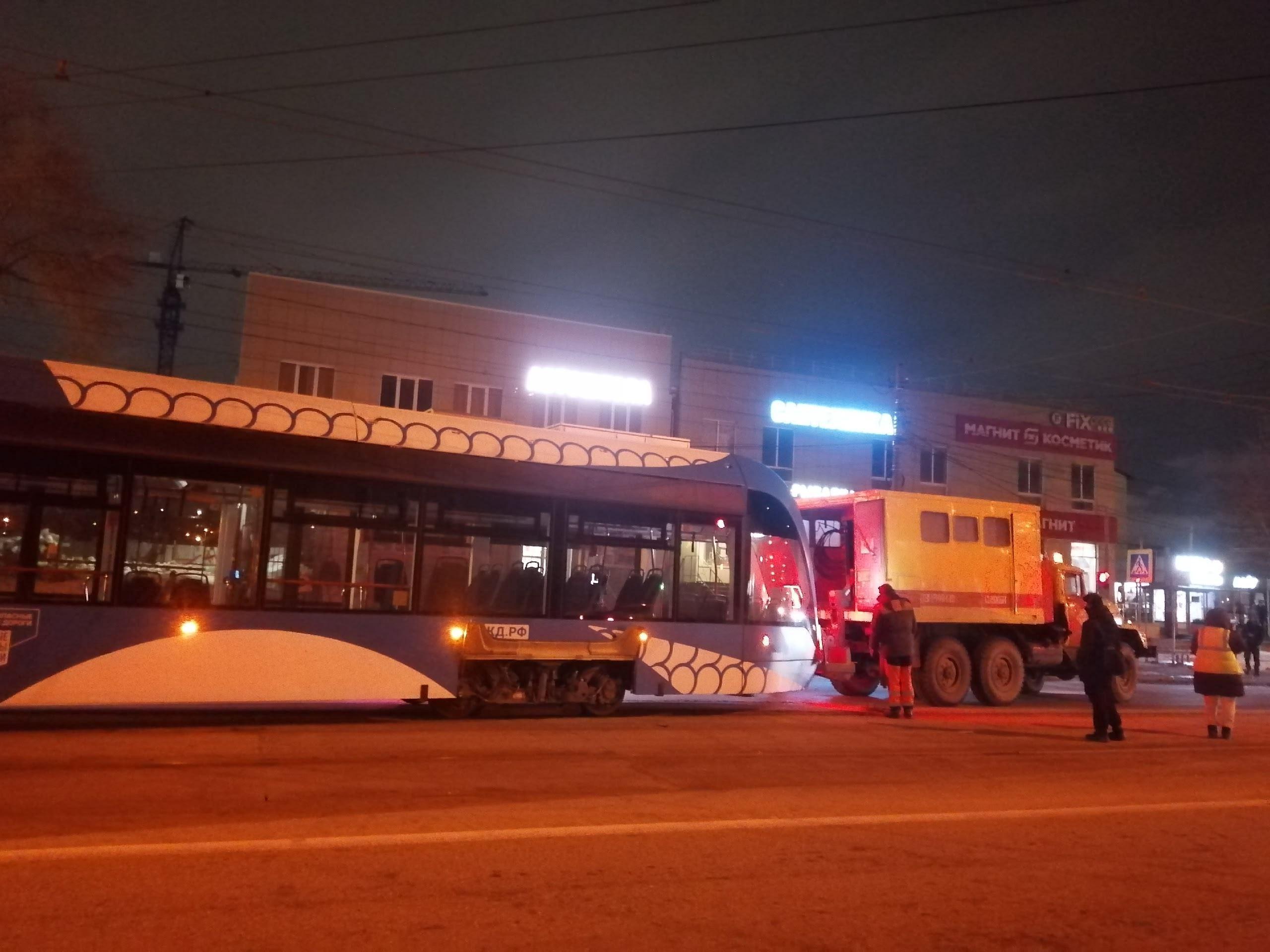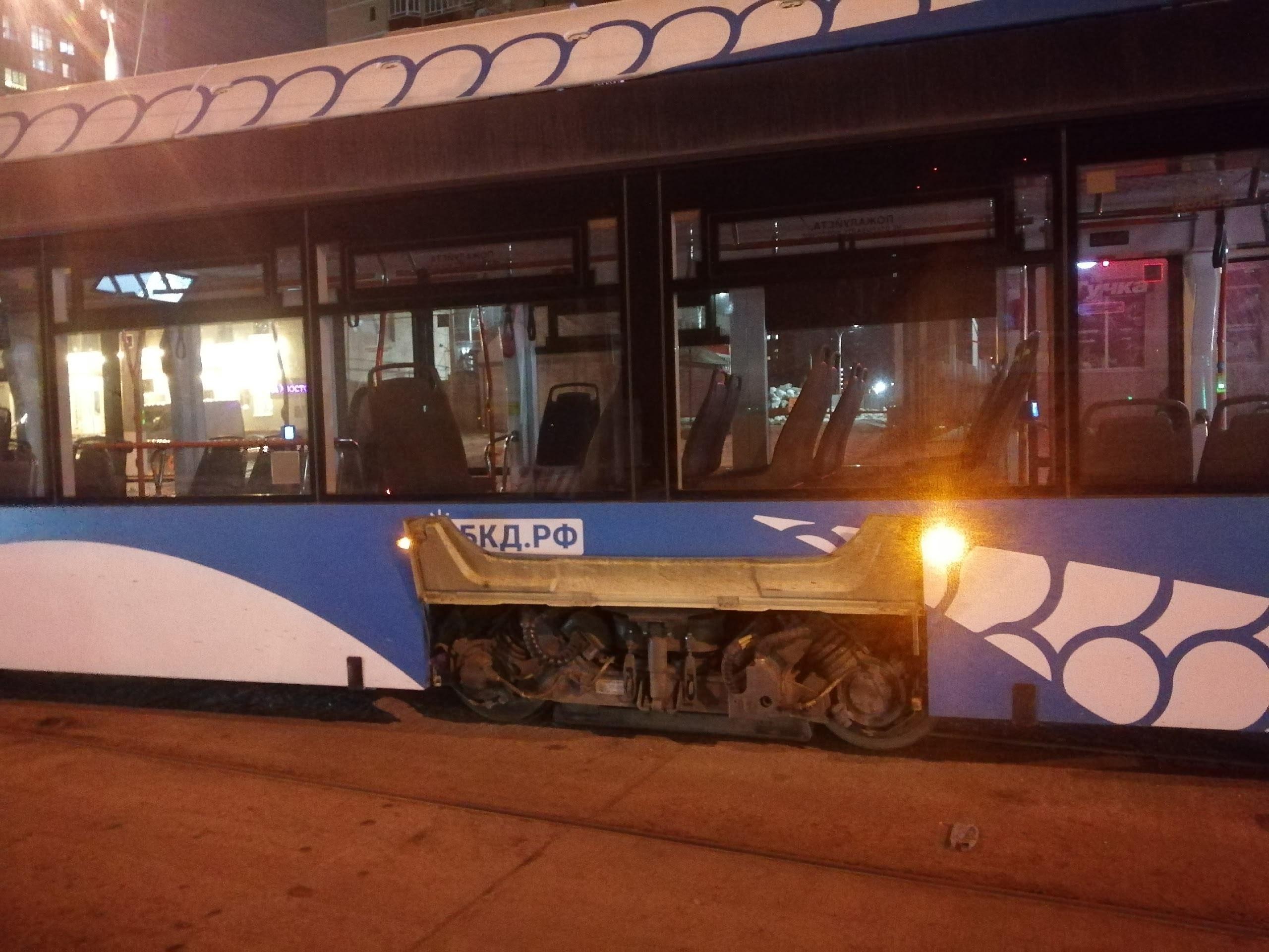 Meanwhile, readers of V1.RU sent a photograph taken on Angarskaya Street. It shows the derailed tram «Lion Cub». Judging by the picture, the rear bogie of the tram car jumped the tracks, causing the tail section to be pushed onto the roadway.