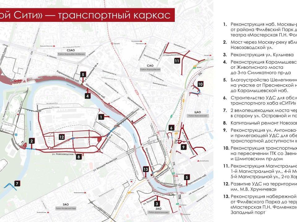 The street network is being developed to serve Moscow City, future offices, and new logistics and business centers. Near Moscow City, Antonova-Ovseenko Street, adjacent streets, and exits from the TTK (Third Transport Ring) will be reconstructed — all to serve «City-2». Also, on the other side of the TTK, exits to «iCity» will be built.