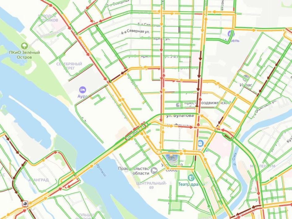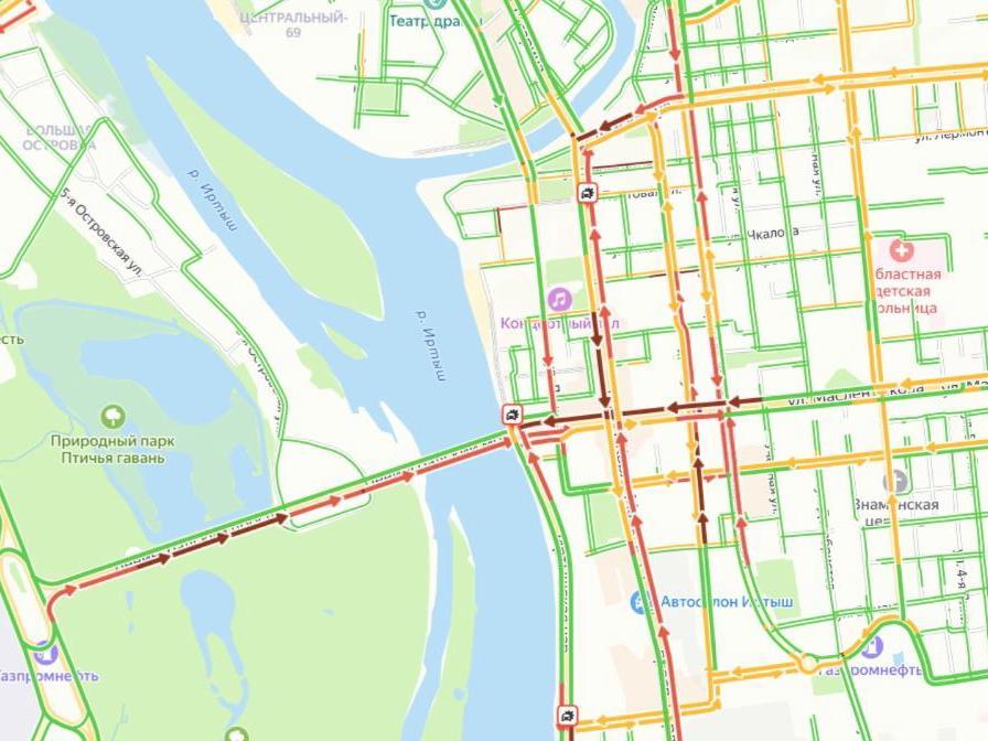 The situation is particularly tense now in the city center. Due to accidents in front of Leningradsky Bridge, on Irtyshskaya Embankment, and Karl Marx Avenue, difficulties are observed on all listed streets and parallel roads. Traffic jams are observed on Pushkin Street, Zhukov Street, as well as on all approaches to the center: on Maslennikov Street, Krasnykh Zor Street, Pochtovaya Street, and Dumnaya Street.