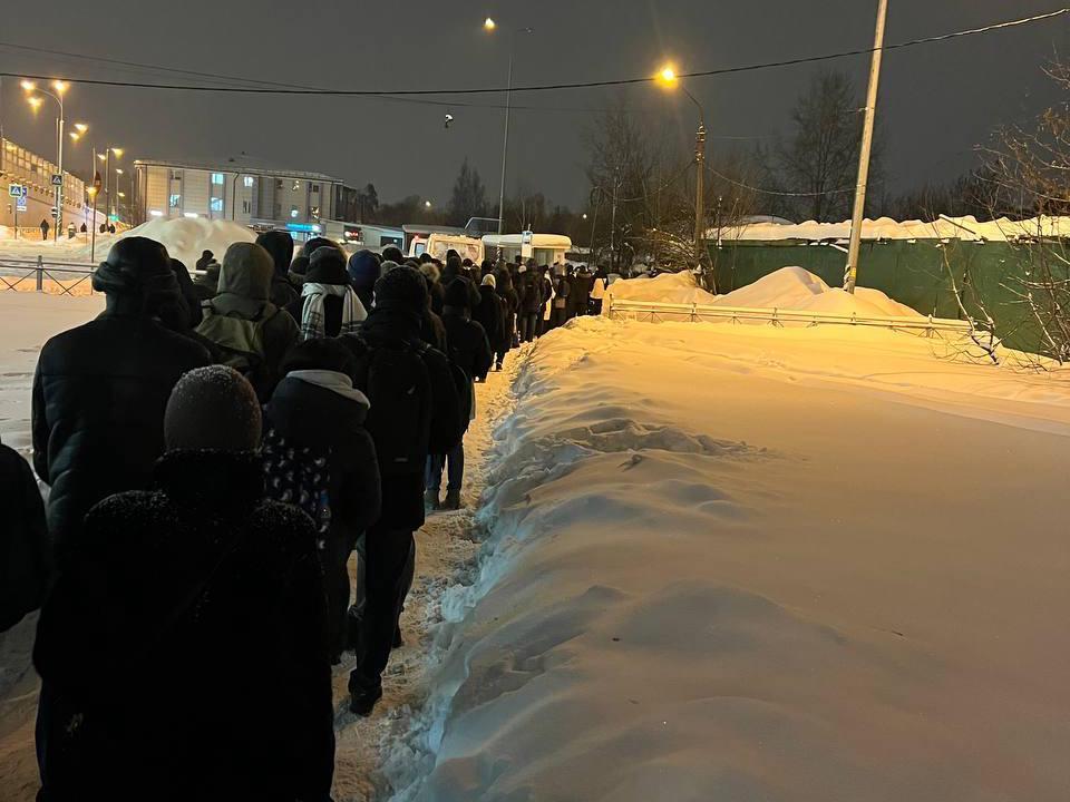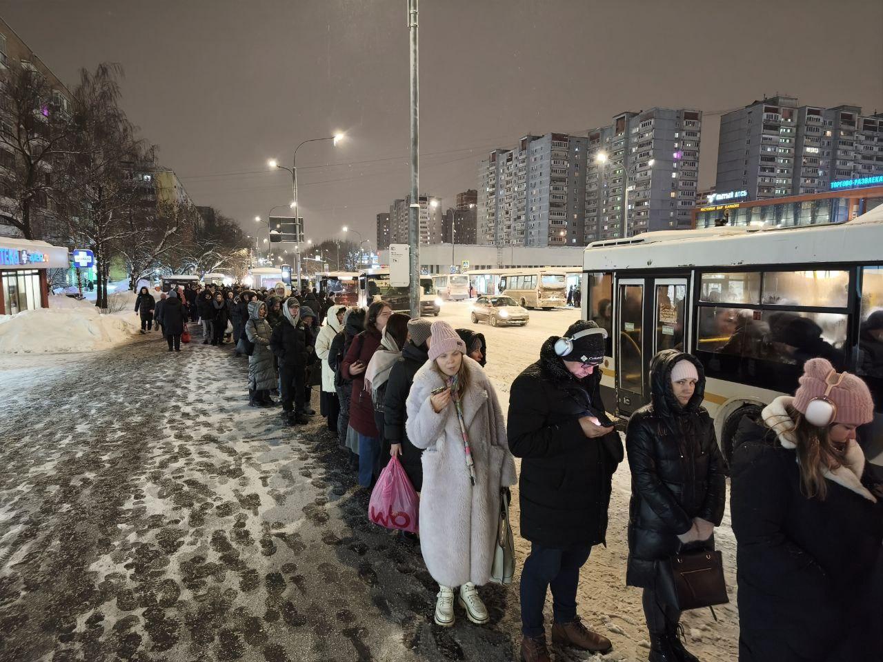 Here, passengers for the bus to the Gorki Park residential complex have lined up in a single-file column. This queue formed near Domodedovskaya metro station.
