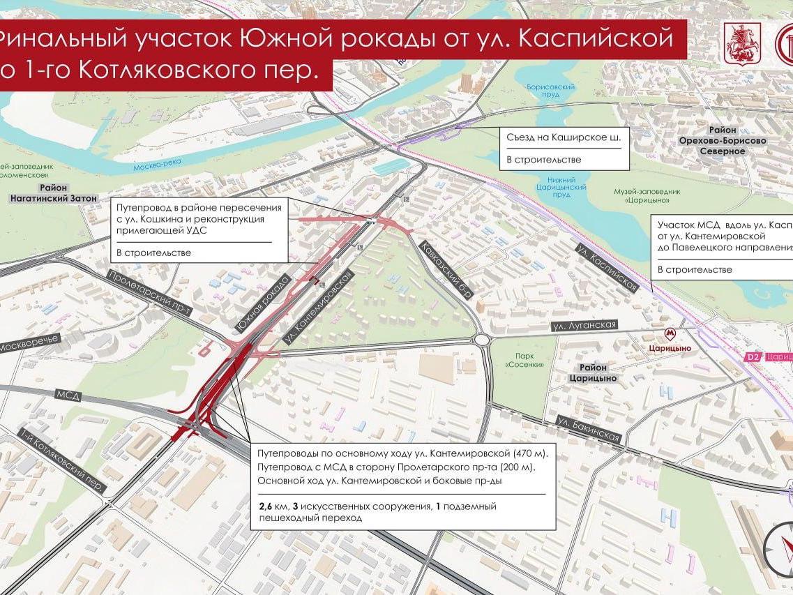 MSD — the Moscow High-Speed Diameter — is a connection between the South-Eastern and North-Eastern Chords. And the Southern Rockade is a highway from Rublyovskoye Highway in the west of Moscow to Verkhniye Polya Street in the south-east of the city. On Kantemirovskaya Street, the two projects intersect.