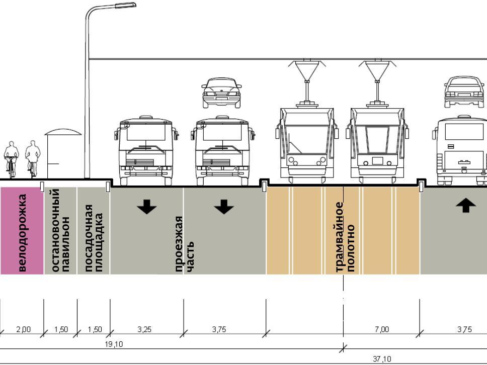 This cross-section profile of Pushkin Street is planned for the area between Borchaninov Street and Kolkhoznaya Square.