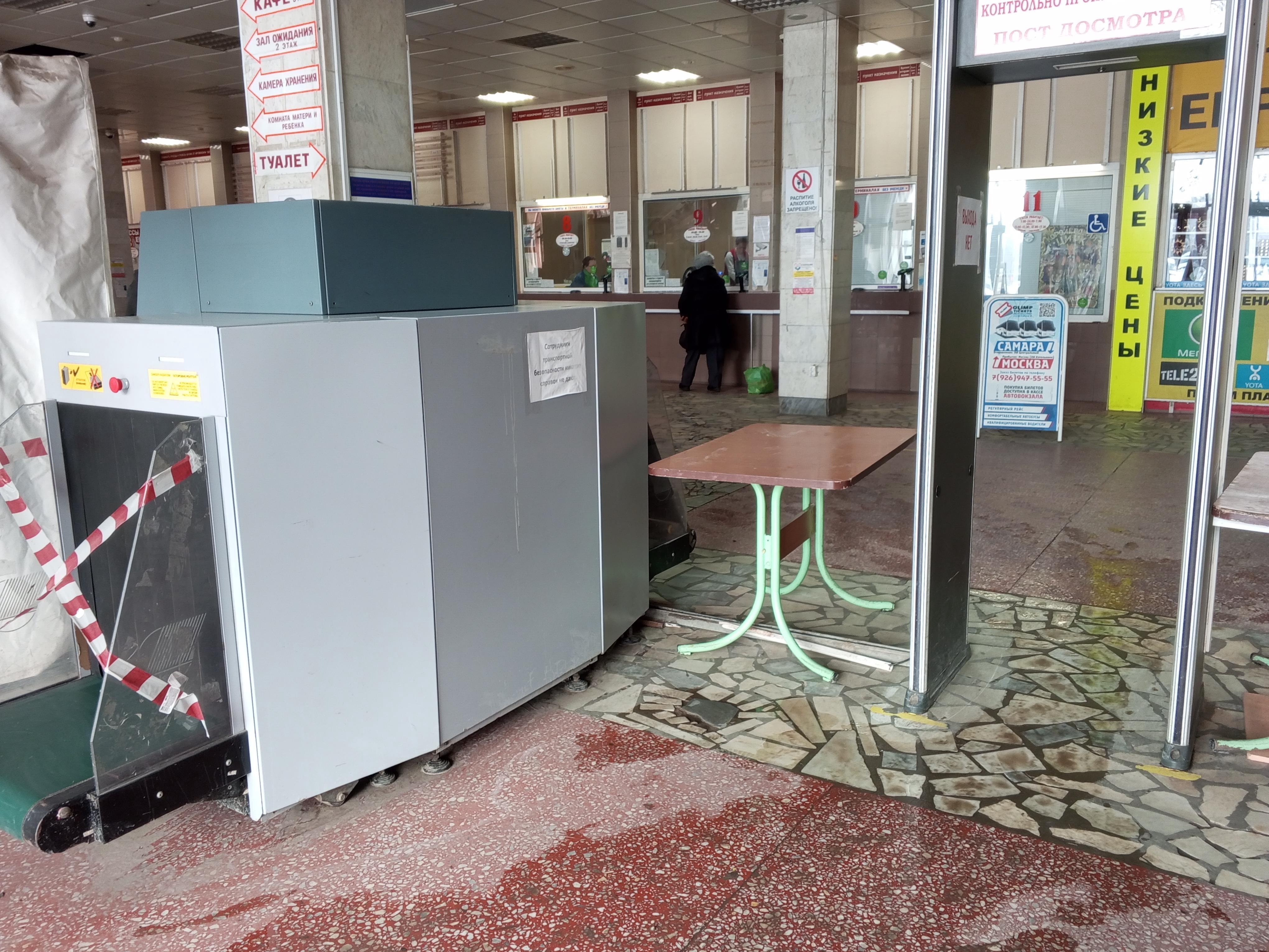 At the entrance to the bus station building, there is a belt for scanning luggage and a metal detector frame. However, they are not working — and, as citizens say, not for the first year.
