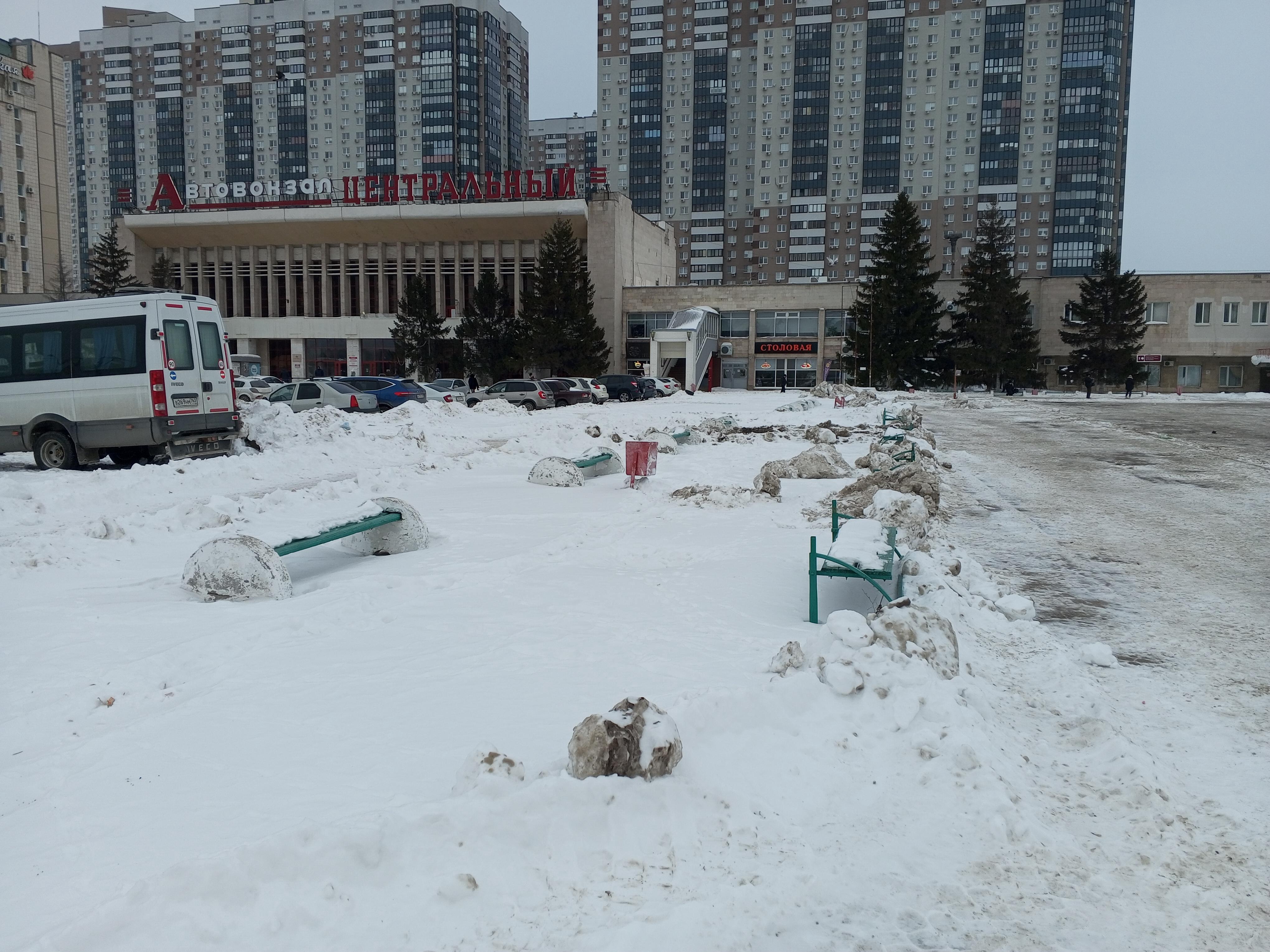 Buses are also brought to the front entrance. Here, too, there is a platform with benches. However, there are few benches and no canopy. In summer, you can quickly get sunstroke here. In winter, the benches are reliably protected from people by blocks of compacted snow, and on top, they are dusted with ordinary — soft — snow.
