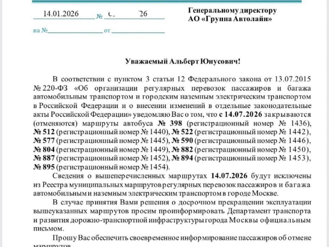 The Department of Transport did not specify the cancellation dates in its response to MSK1.RU. Earlier, an allegedly real document appeared on social media, in which the first deputy head of the Department of Transport informed the carrier «Avtoline» about the cancellation of these routes in New Moscow from July 14, 2026.