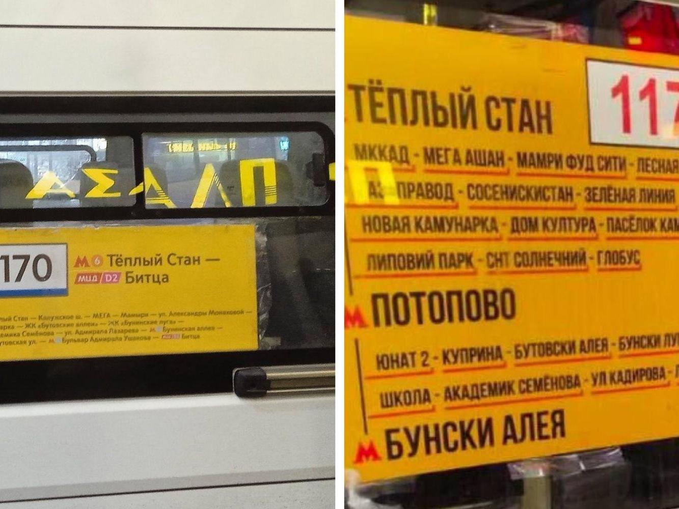 A year ago, one of the minibuses from Tepliy Stan (it is not yet on the list) was involved in a scandal: on its sign, almost all the names, even the Moscow Ring Road, were misspelled. For example, Muscovites saw the inscriptions «Soseniskistan», «House of Cultur», «Bunski Meadows» — look at all the gems.