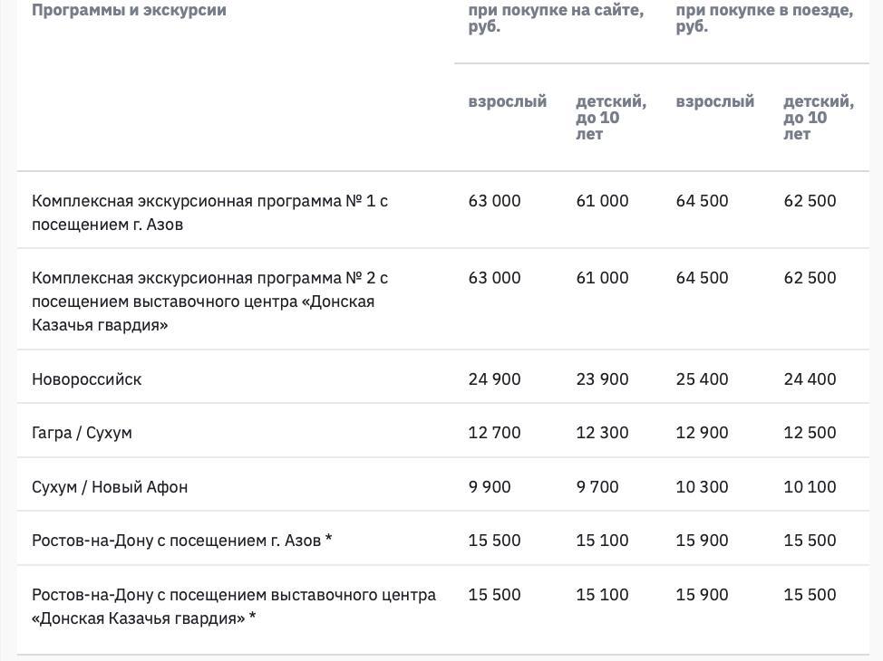 Ticket prices start from 9,900 rubles (about $110 at current rates) for visiting only Sukhum and New Athos. The most expensive option is the comprehensive excursion program for 63,000 rubles (about $700 at current rates). Tickets will appear on the Russian Railways website soon.
