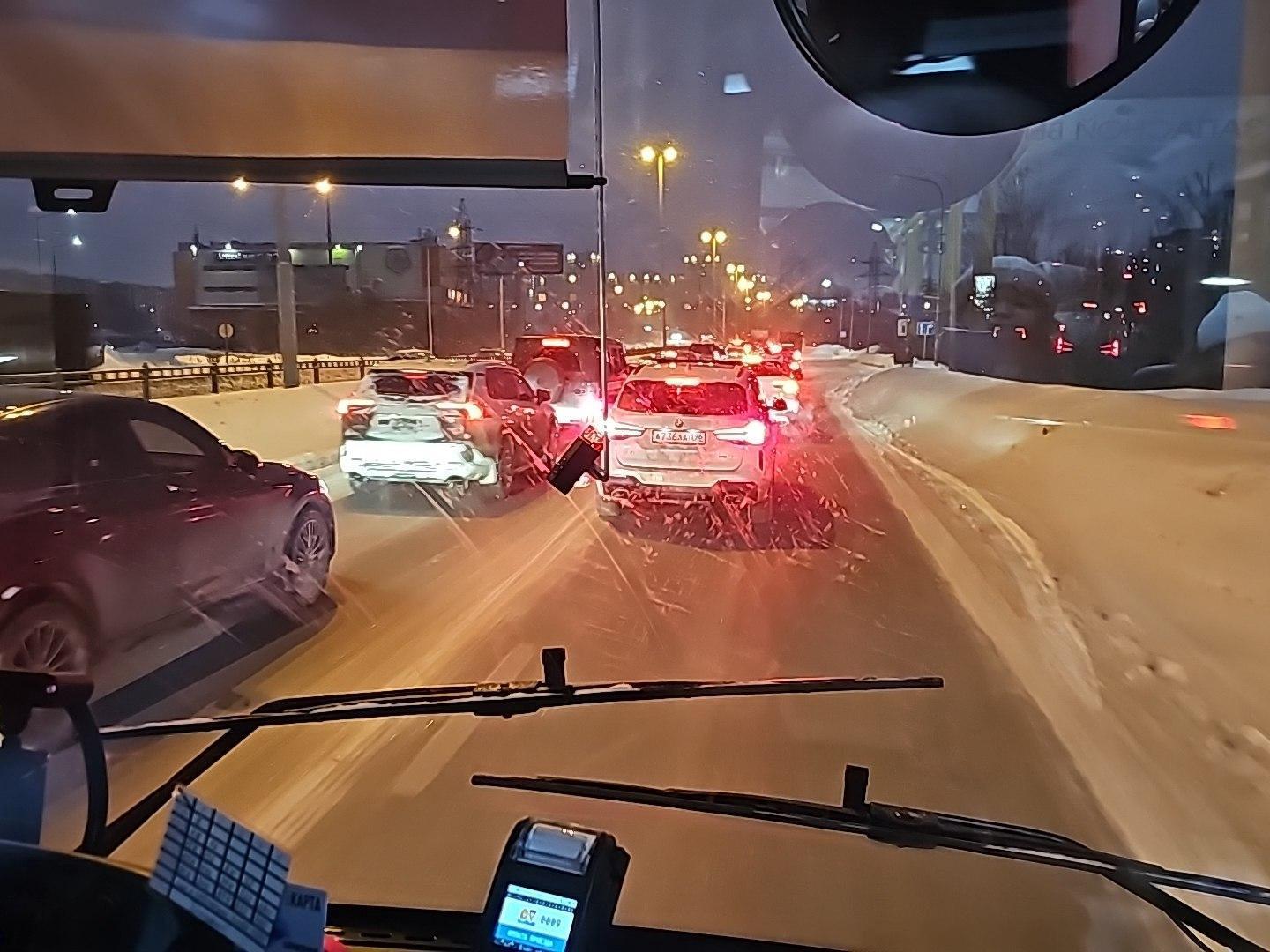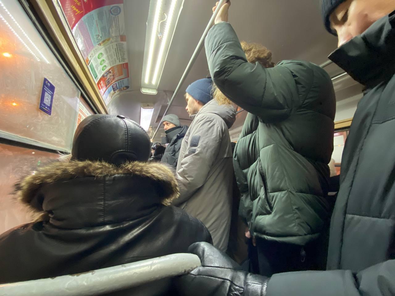 I talked to fellow passengers, who said they regularly use this route and have no complaints about its operation. The bus waited for passengers at the terminus with a cold cabin — there was even a frozen puddle on the wheelchair platform. It thawed as the bus crawled through the traffic jam on the dual carriageway of Sibirsky Trakt. The front part of the cabin was warm for most of the trip. The same cannot be said for the rear section of the articulated bus — I felt the cold as soon as I moved to the back.