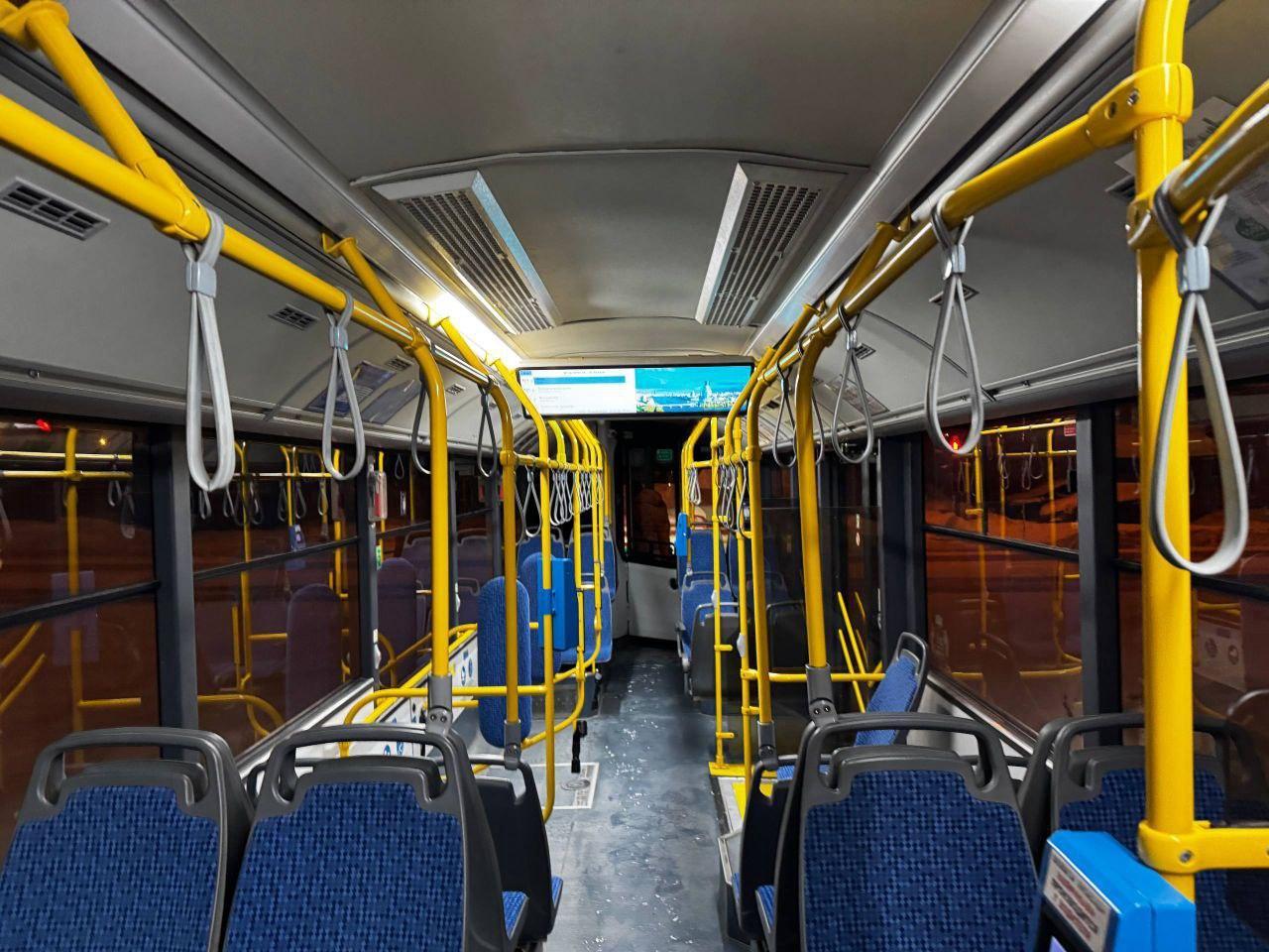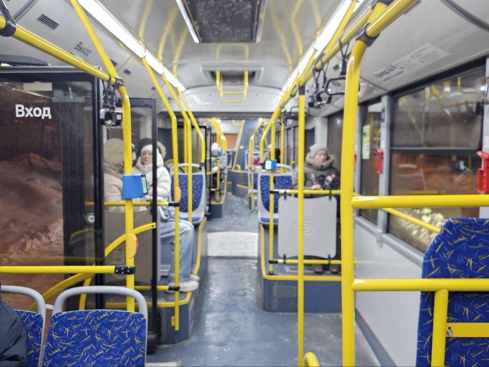 The number 49 bus was a pleasant surprise — it arrived at the stop early and waited for me. Several passengers took seats in the cabin. The route uses brand new articulated Volgabus buses that appeared in the city last summer. I had never ridden in one before, so I was happy to see the new display screens, payment terminals, and the spacious interior, which had free seats for new passengers throughout the entire trip.