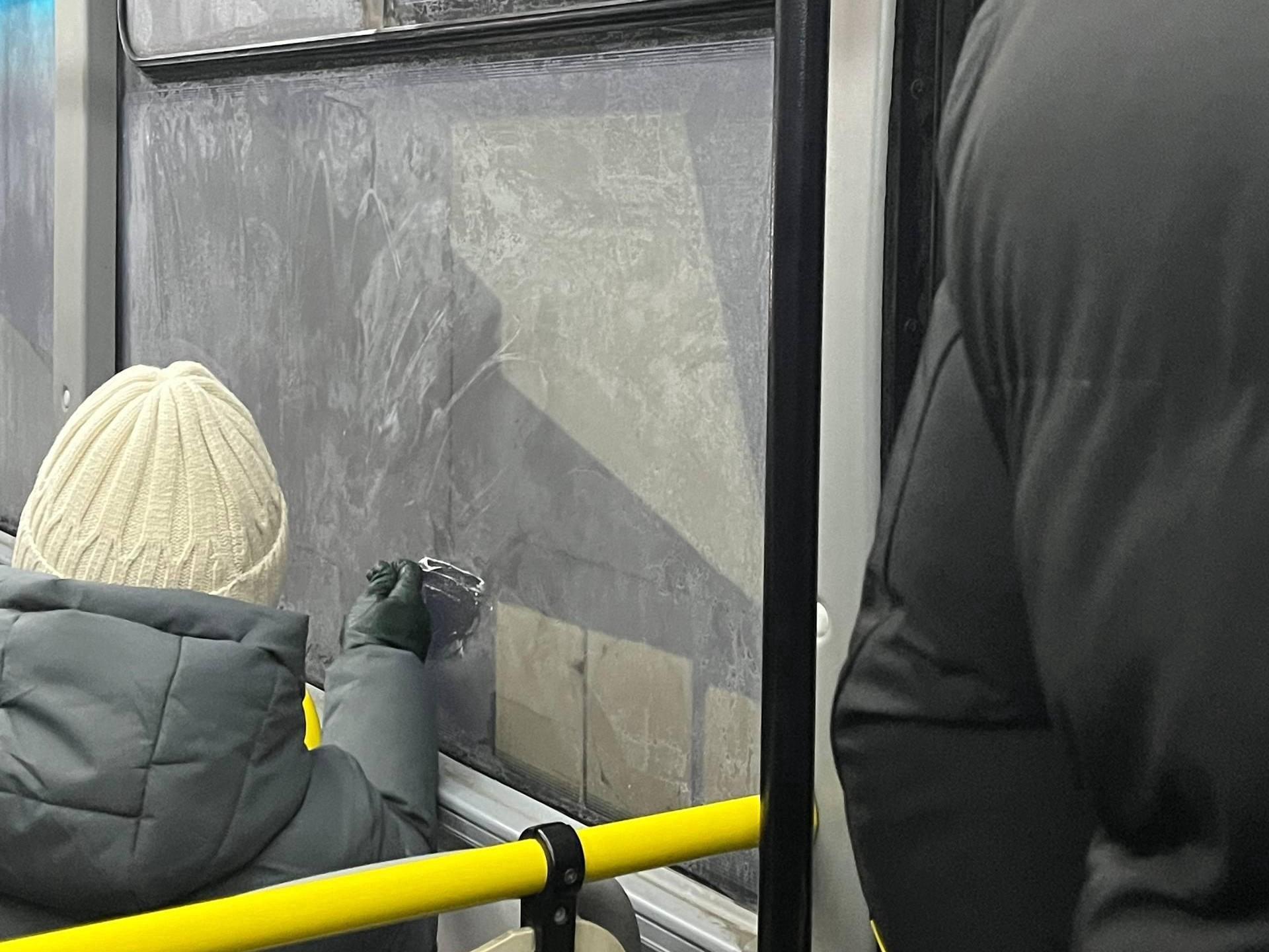 Due to the cold, the windows in the bus cabin have become frosted over.