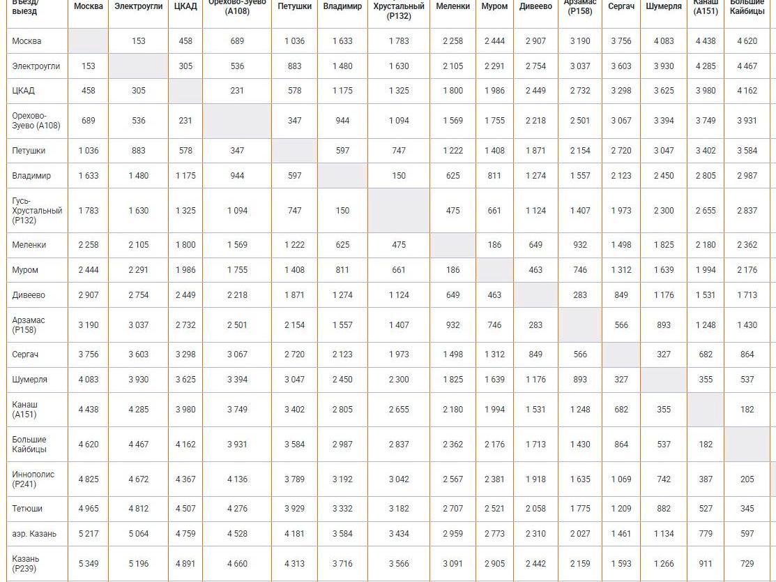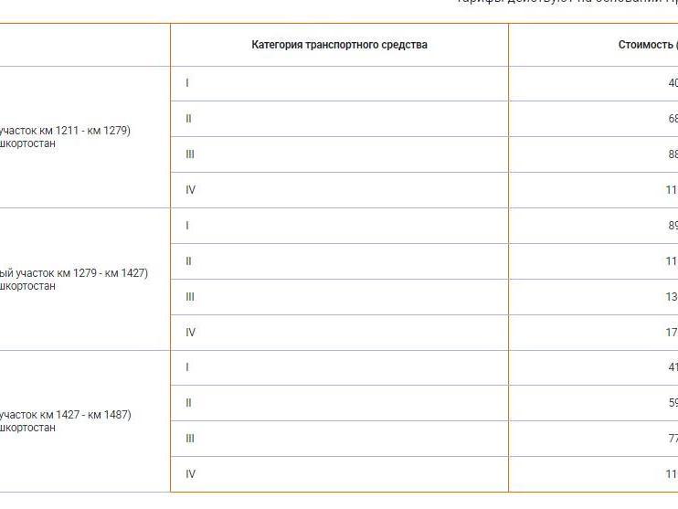 The cost for the longest segment—from Moscow to the village of Shali in Tatarstan—currently stands at 5,399 rubles (about $60) for passenger cars, 8,274 rubles (about $92) for SUVs and minivans, 10,334 rubles (about $115) for trucks, buses, and specialized vehicles over 2.6 meters (8.5 ft) in height, and 11,925 rubles (about $133) for oversized vehicles.