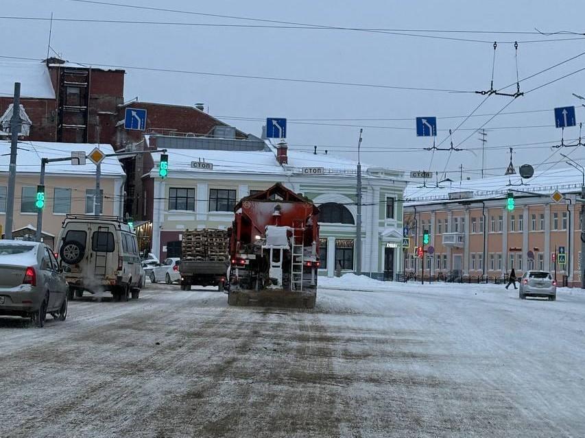 A sand-salt mixture is being deployed on central Yaroslavl streets to enhance traction and melt ice during winter conditions.