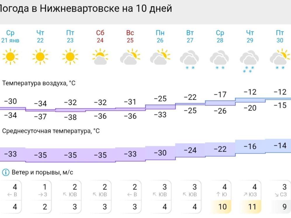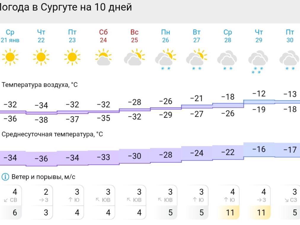 As reported by Gismeteo, in Surgut and Nizhnevartovsk more moderate temperatures of -12…-18 degrees Celsius (10…0°F) are expected on January 28–29, with snowfall and strong winds with gusts up to 11 m/s (about 25 mph).