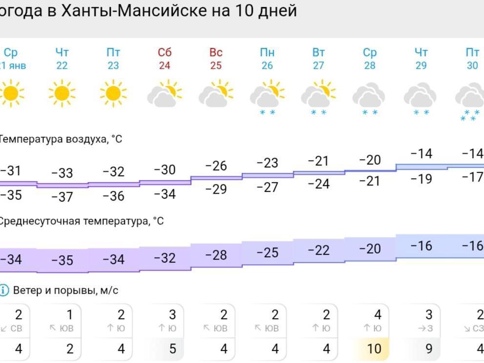 In Khanty-Mansiysk it will warm up only on Thursday-Friday of next week. Temperatures around -16 degrees Celsius (3°F) and snowy precipitation are expected.