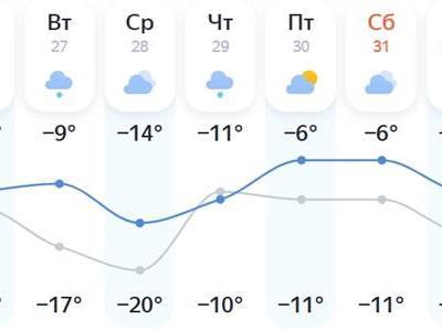 According to this service, the new week will begin with a daytime temperature of -11°C (12°F). On 28 January, it will cool down slightly to -14°C (7°F), but after that, the thermometers will start rising quickly. By the end of the week, the daytime air will warm up to -9…-6°C (16…21°F). At night, severe frosts are not expected either — the temperature will not drop below -22°C (-8°F), and on the weekend it will even warm up to -13…-12°C (9…10°F).