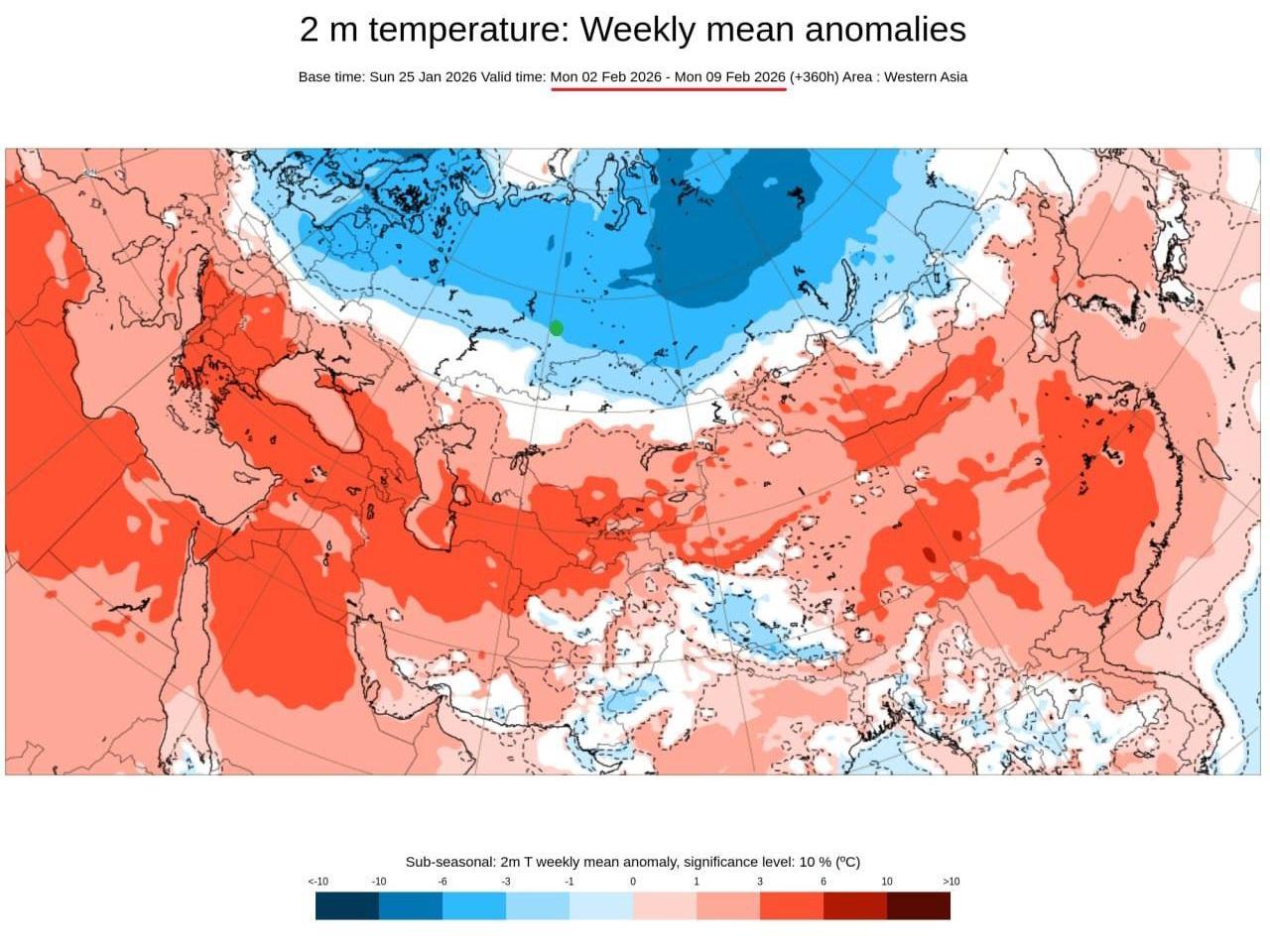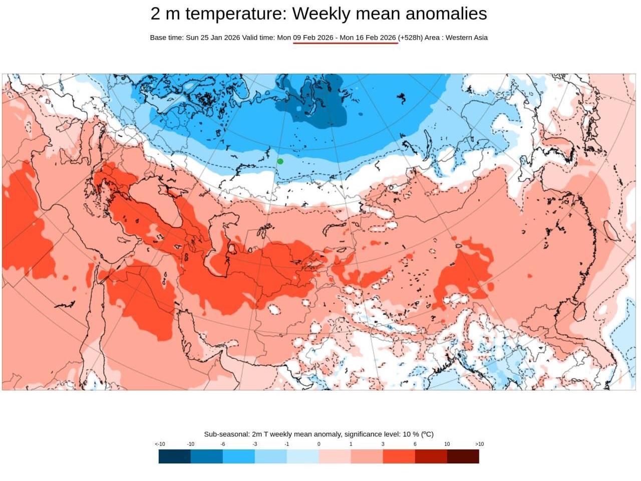 ‘The first half of February in Sverdlovsk Oblast is expected to be cold. The figures show the expected distribution of deviations from the climatic norm of average air temperature for the first and second weeks of the month according to the ECMWF (European Centre for Medium-Range Weather Forecasts) model. Yekaterinburg is marked with a green circle,’ the expert wrote.