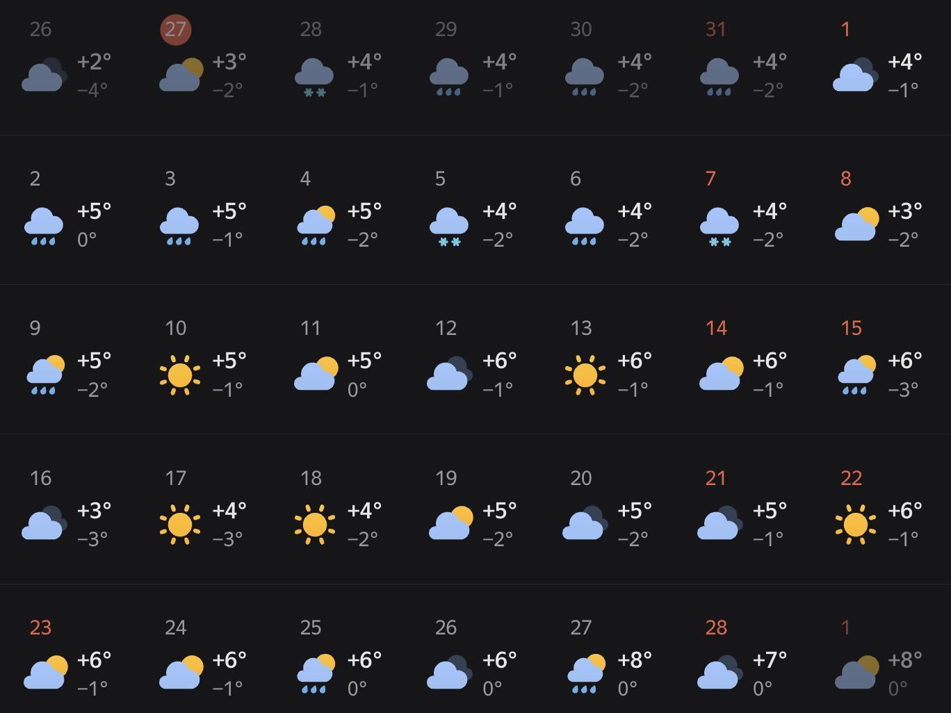 No significant warming is anticipated yet, only at the beginning of the month for a few days the air will warm up to as high as +18 °C (64 °F).