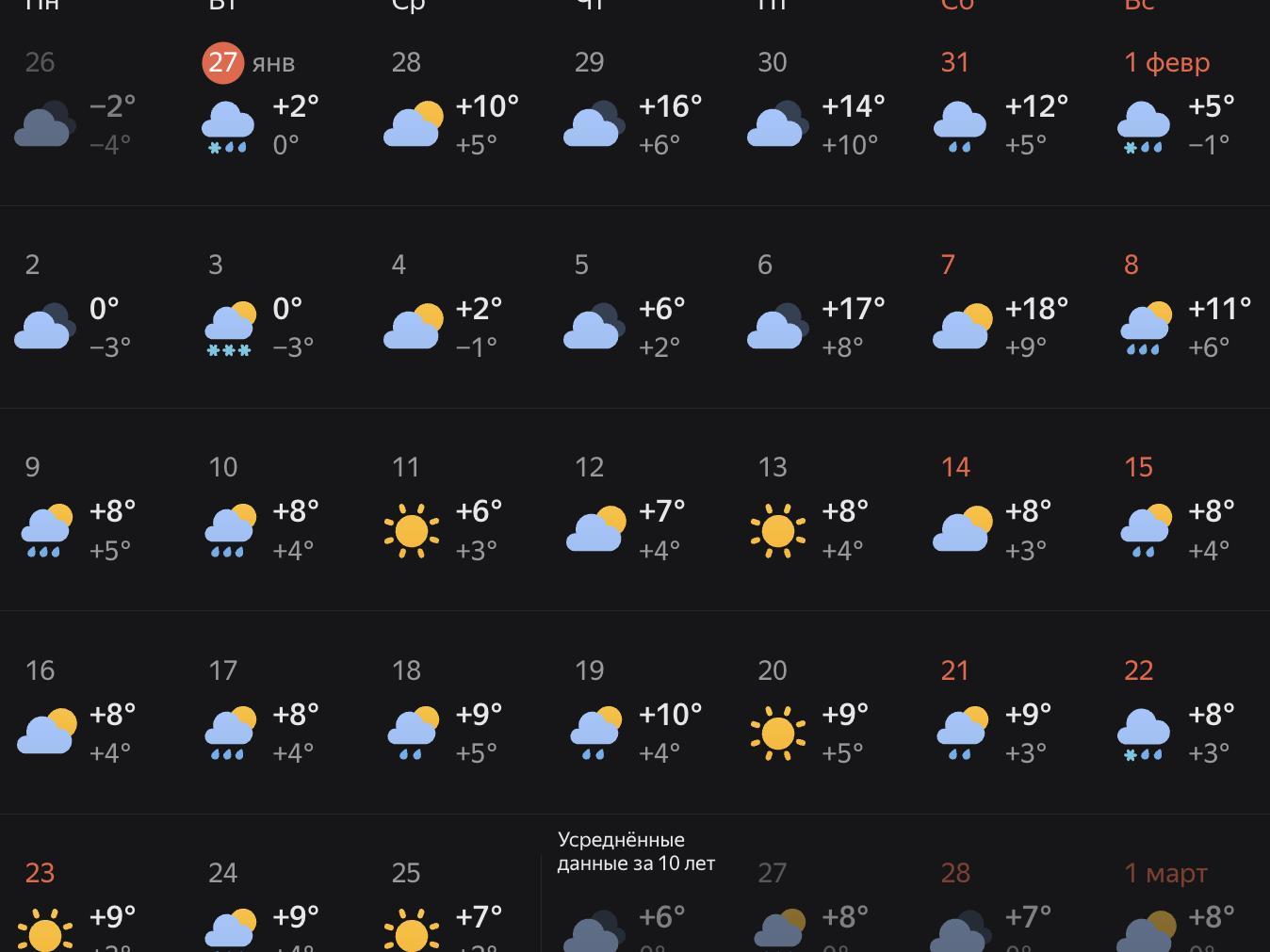According to Yandex«s average weather forecast over the last 10 years, February in Krasnodar is traditionally cloudy and rainy. The month has only 12 cloudy, 8 rainy, 5 clear, and 2 snowy days.