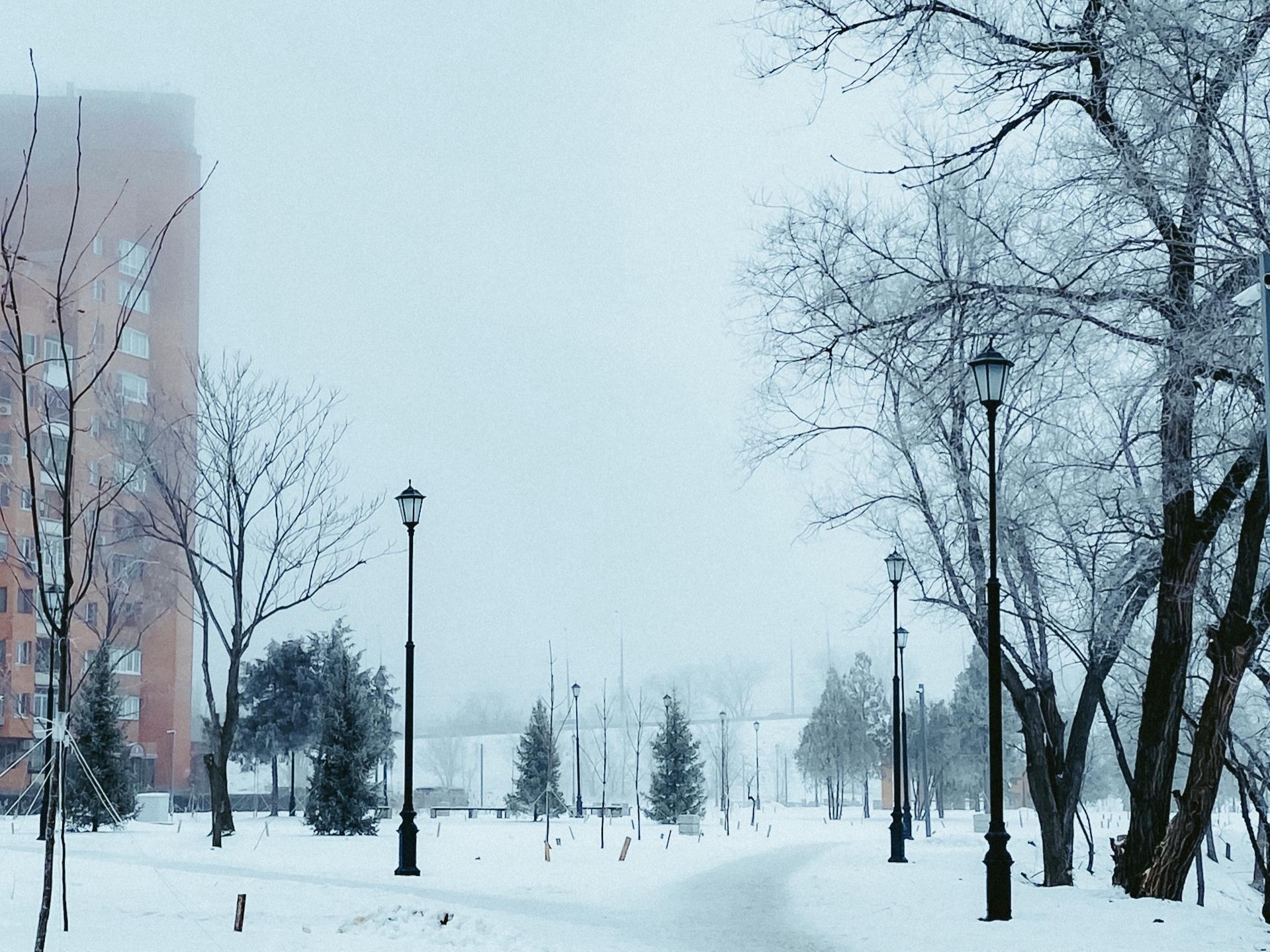 Snowy landscapes and foggy atmospheres captured in the Krasnoarmeysky area of Volgograd.