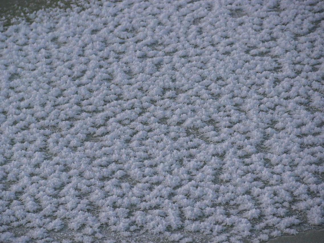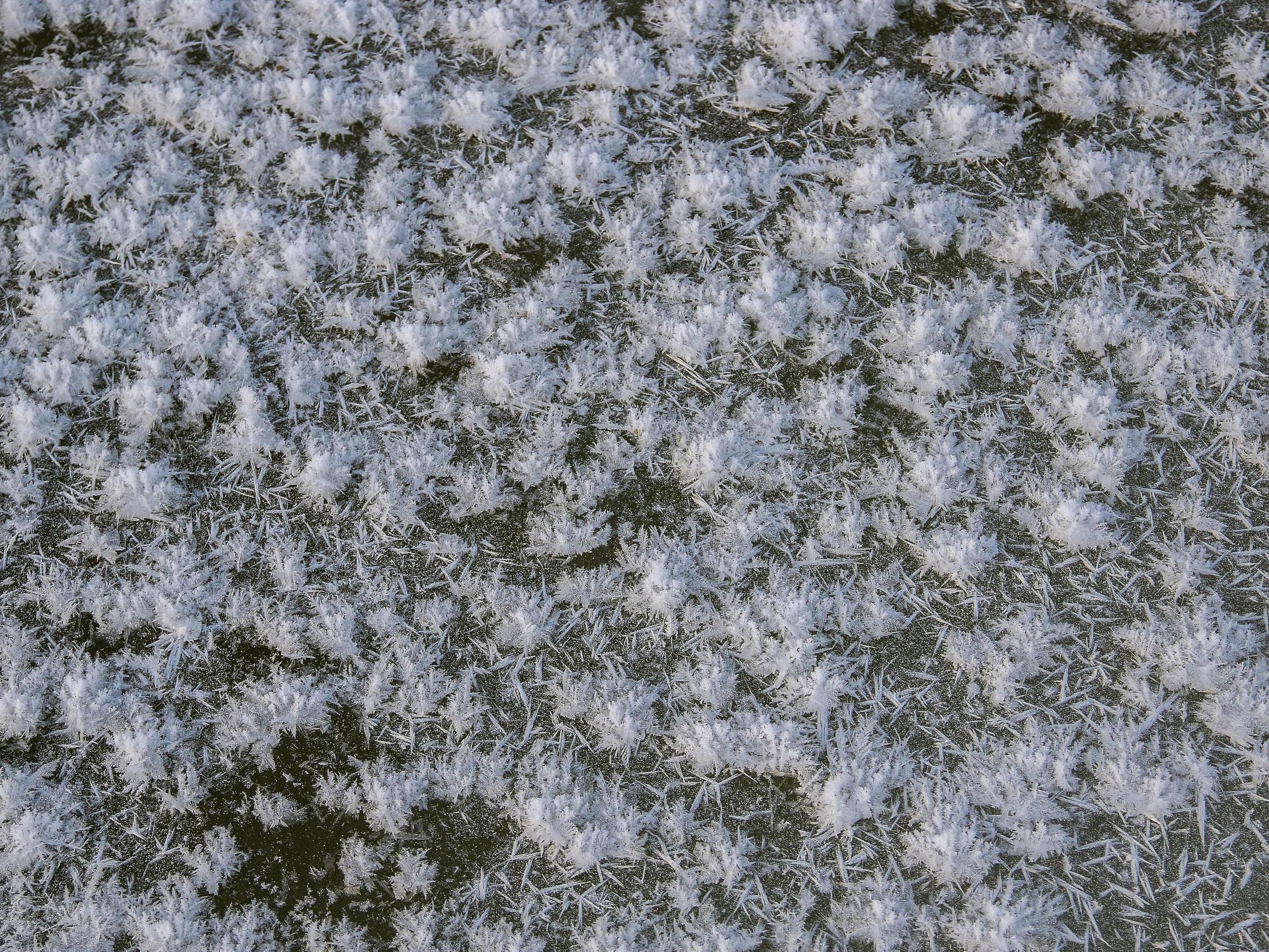 For the flowers to «grow», the air temperature must be below -20 degrees Celsius (-4°F). Absolutely windless weather is also necessary. Under favorable conditions, a layer supersaturated with moisture forms on the ice, right at its surface. Water droplets crystallize upon sudden cooling and settle on the thin ice.
