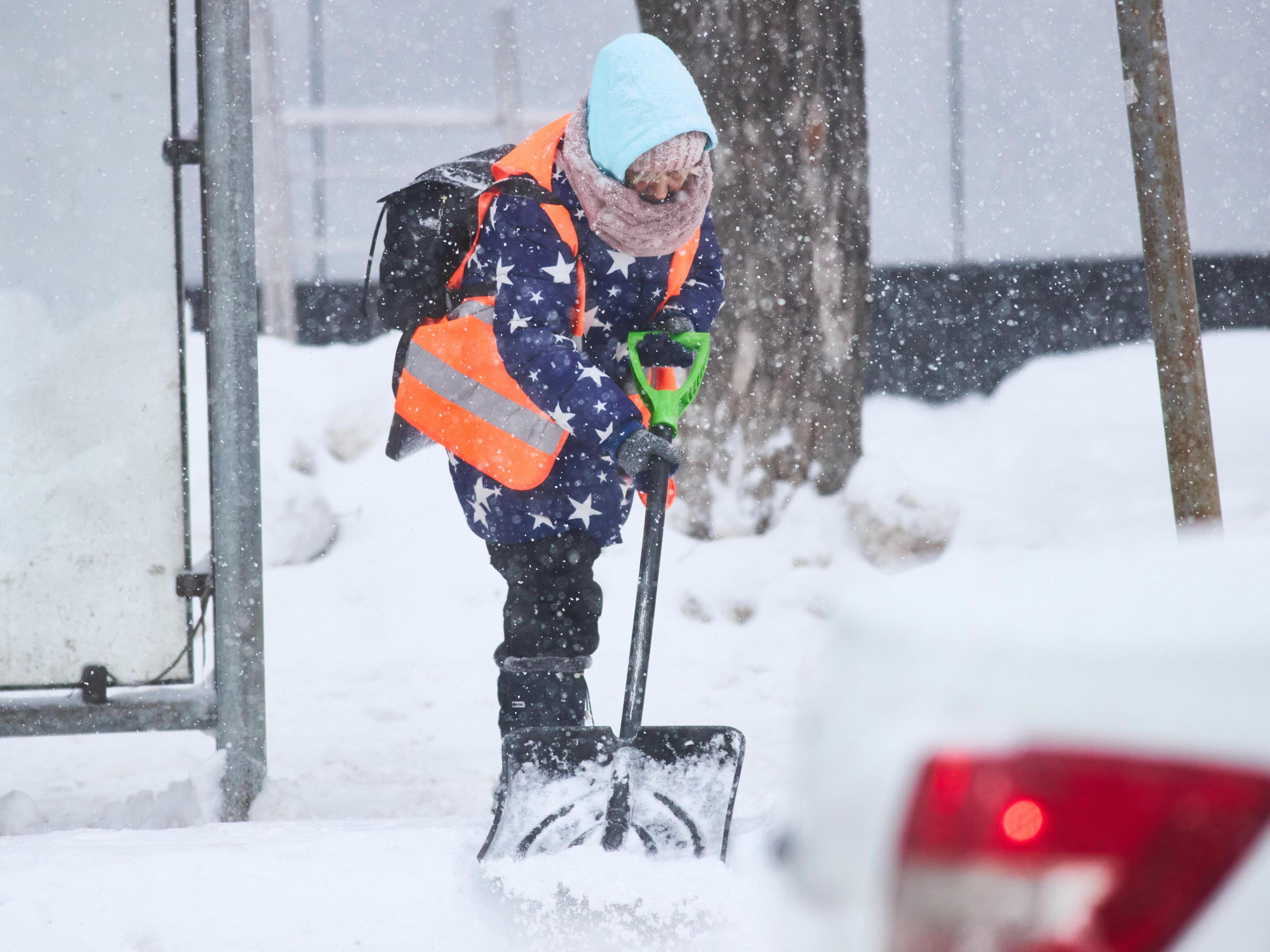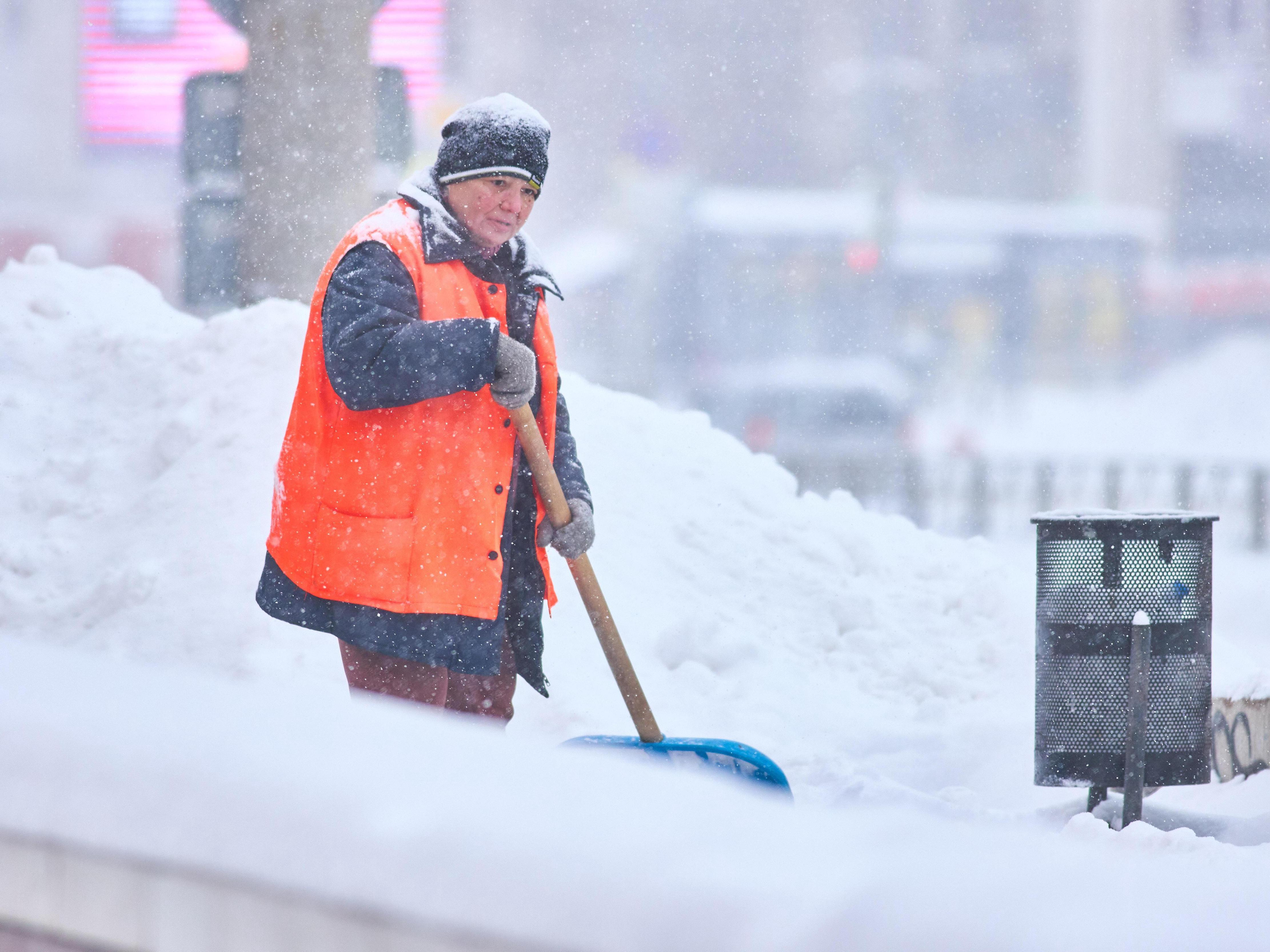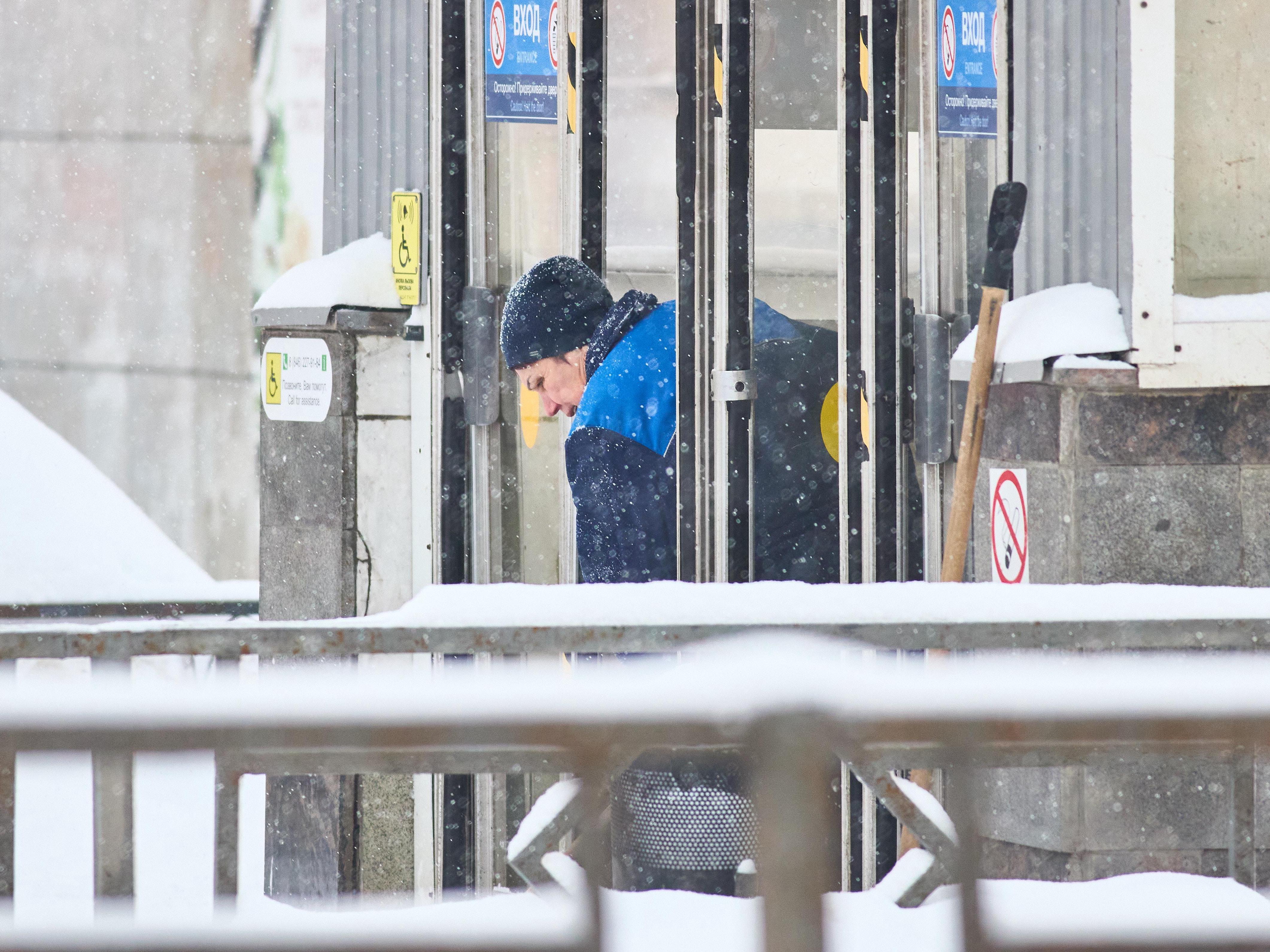 A worker clears snow from the steps of a metro station entrance.