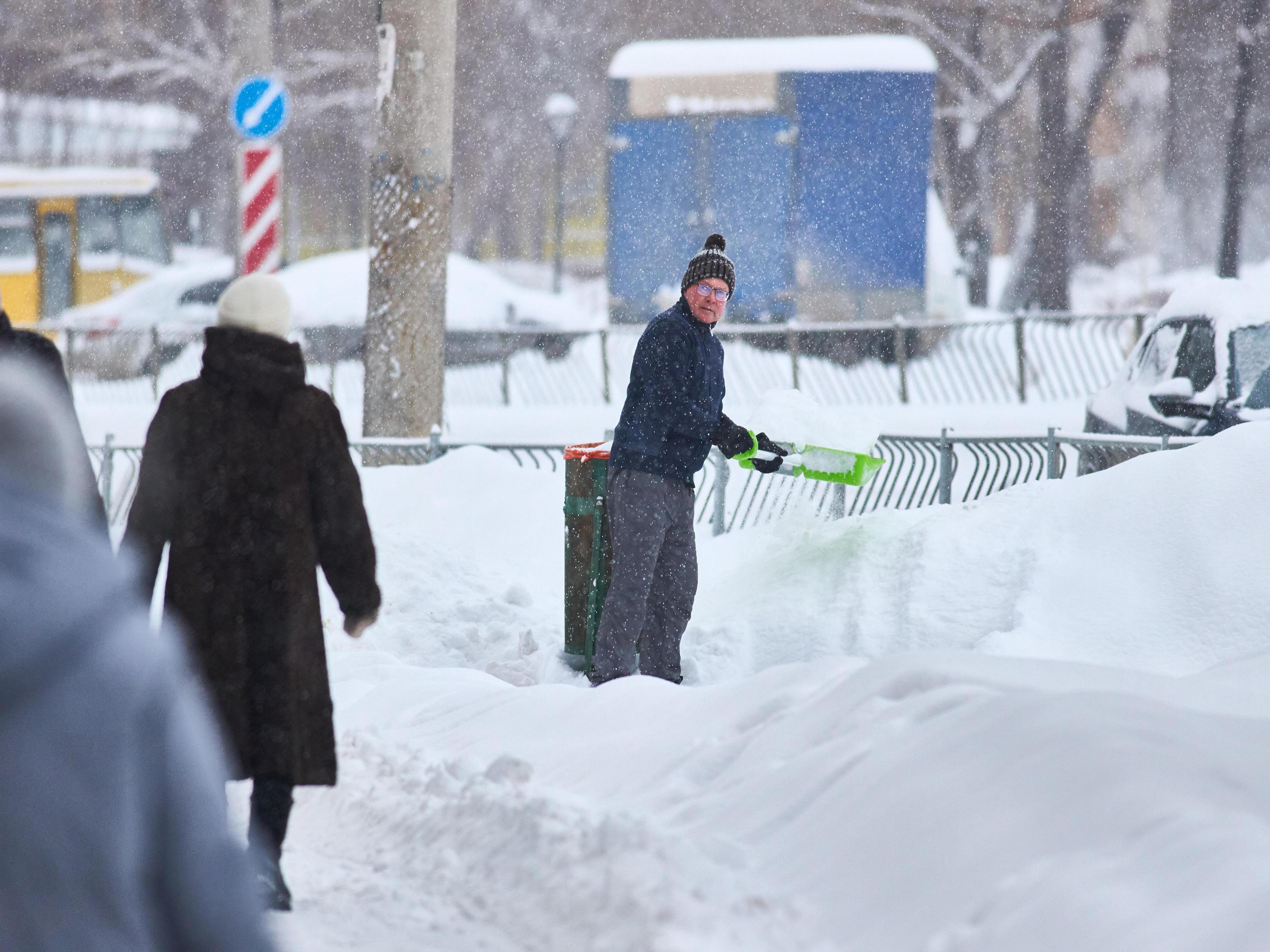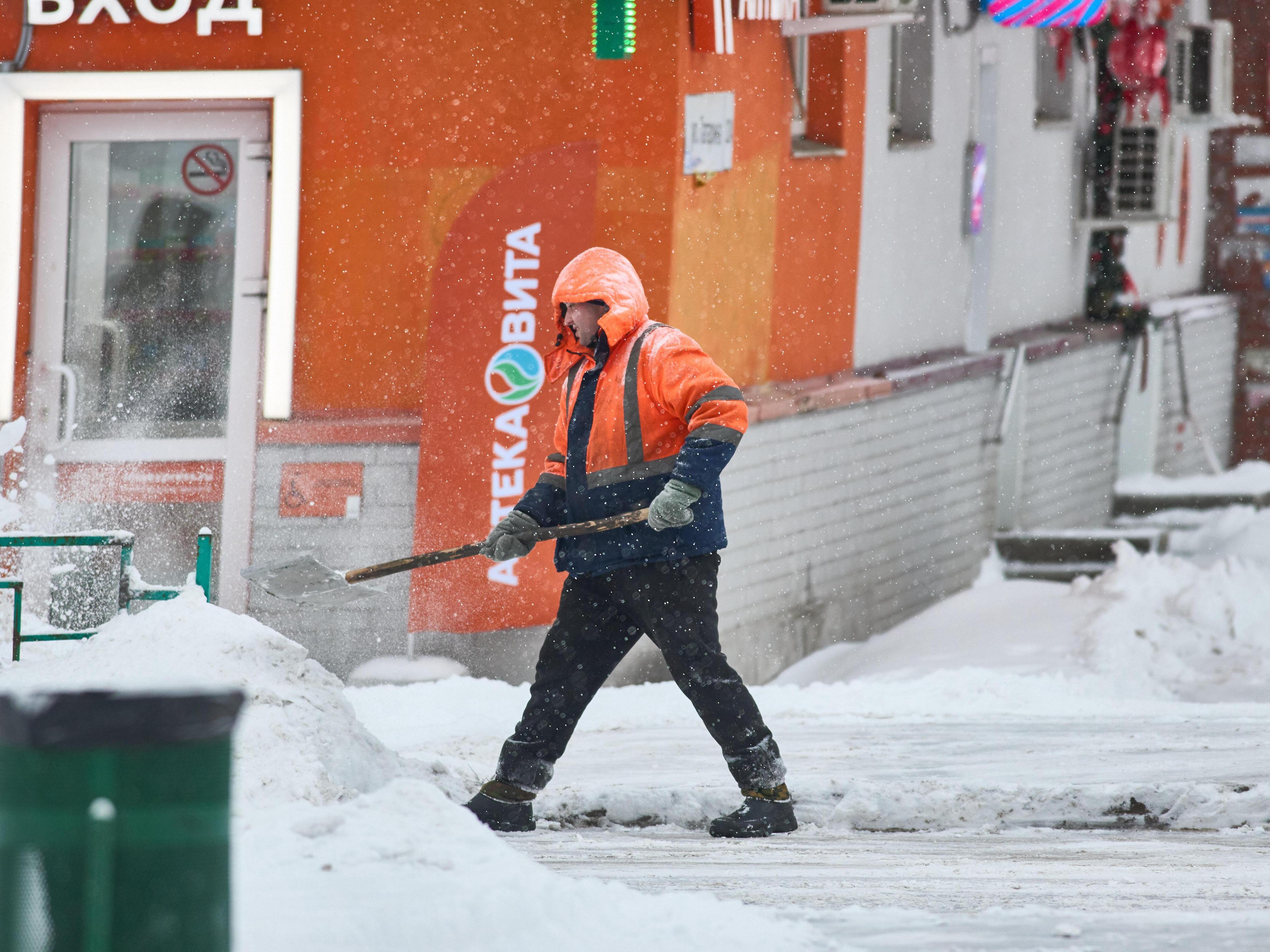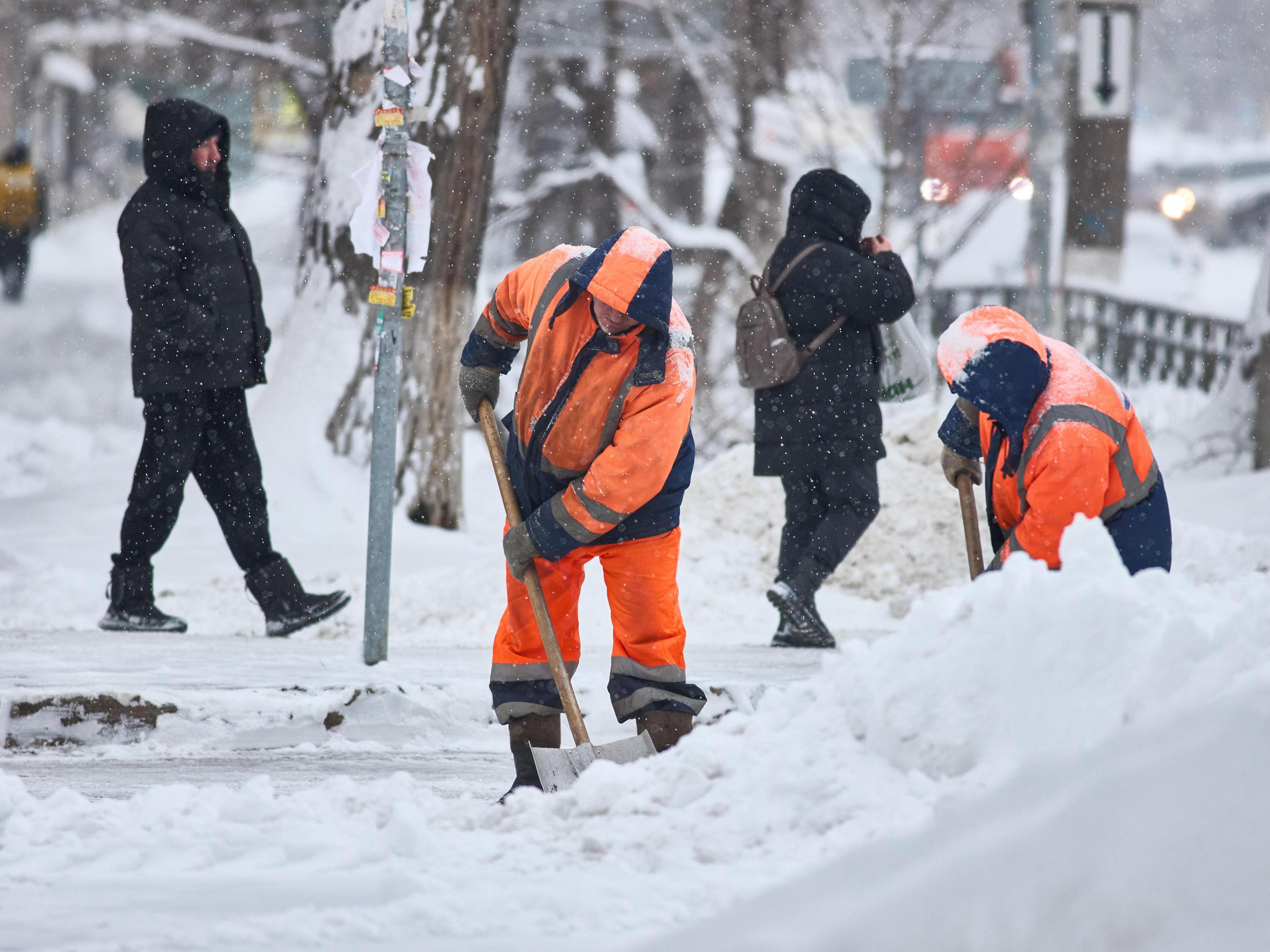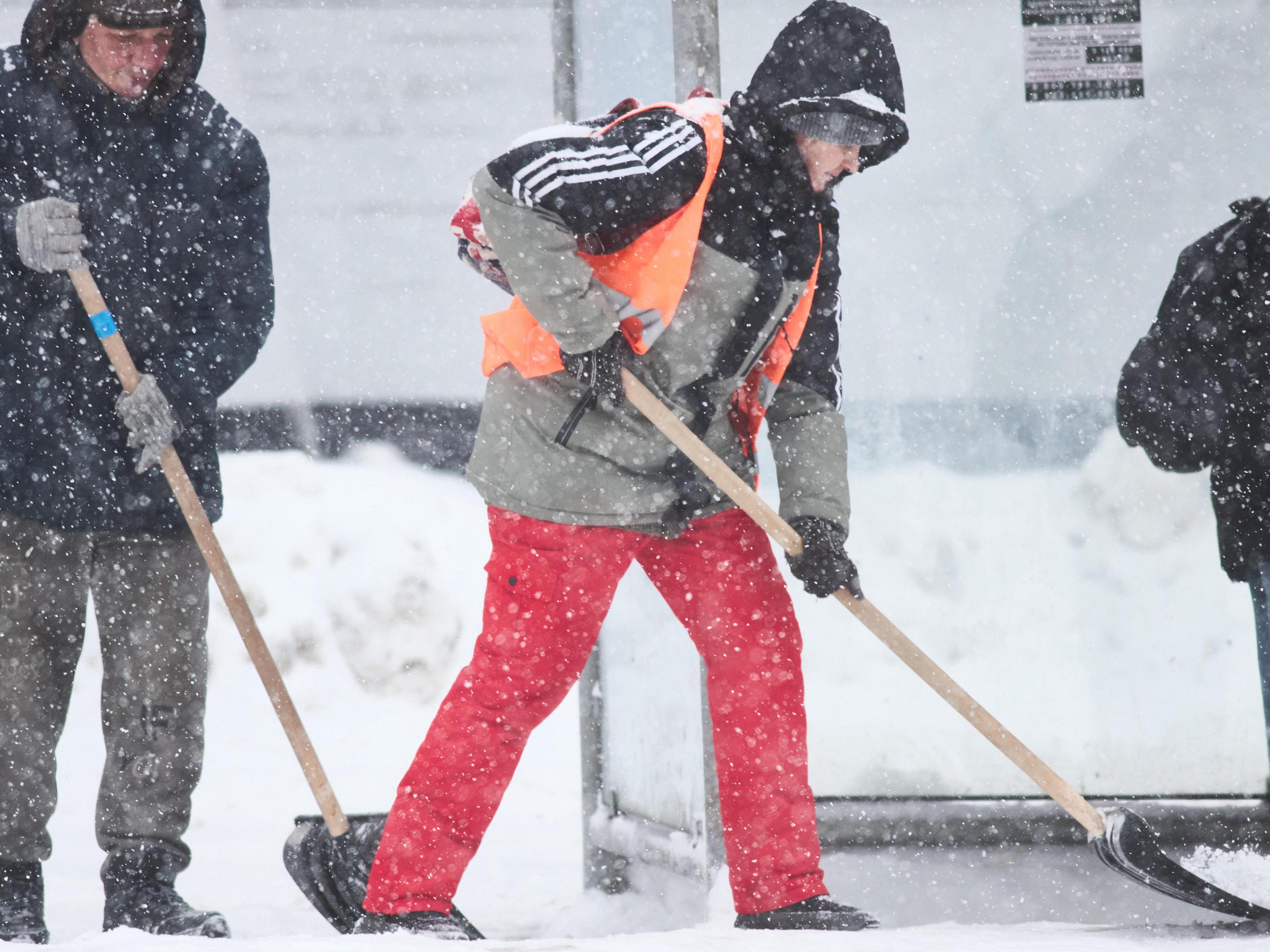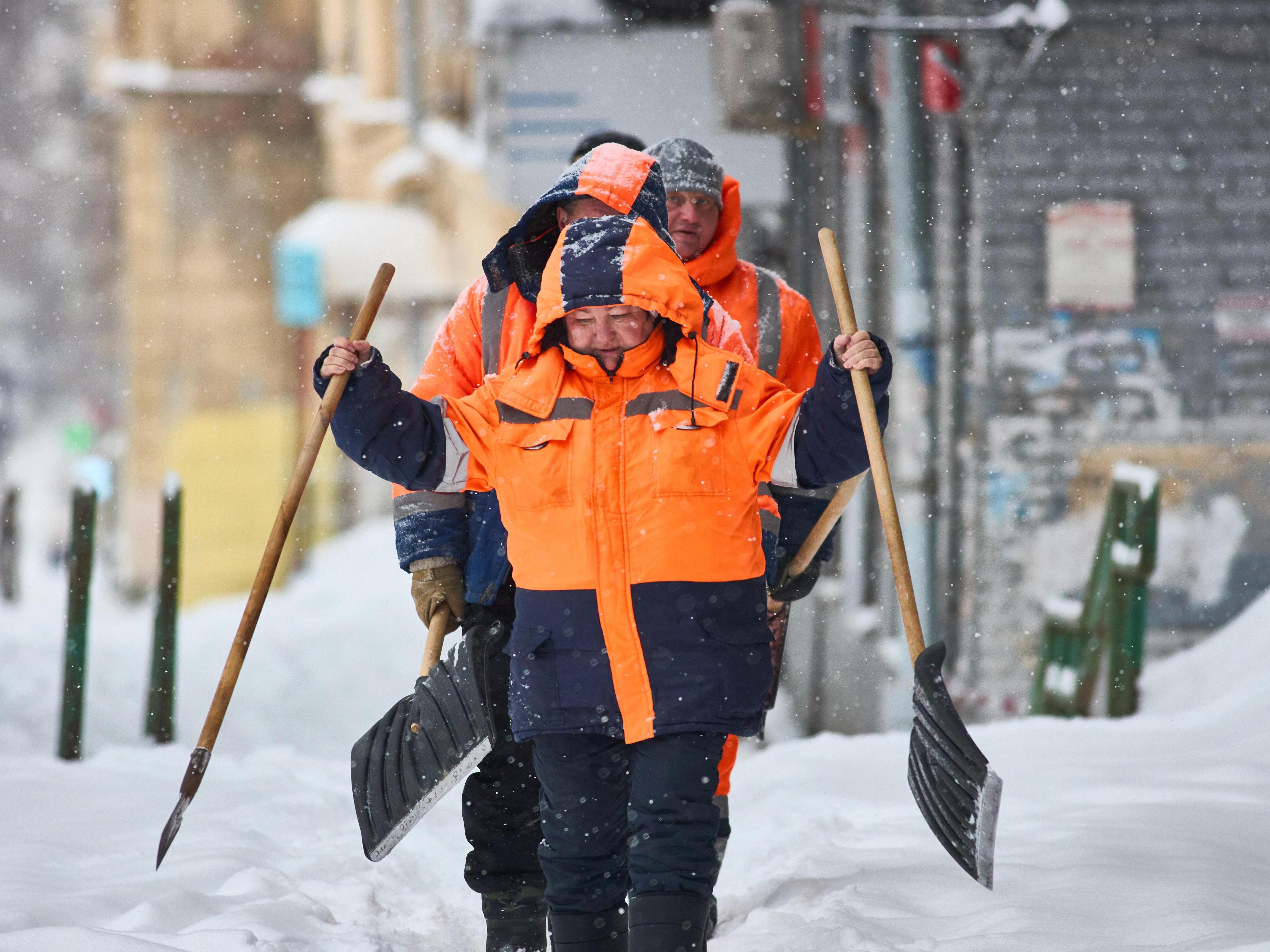 Workers get a workout shoveling snow near Sportivnaya metro station.
