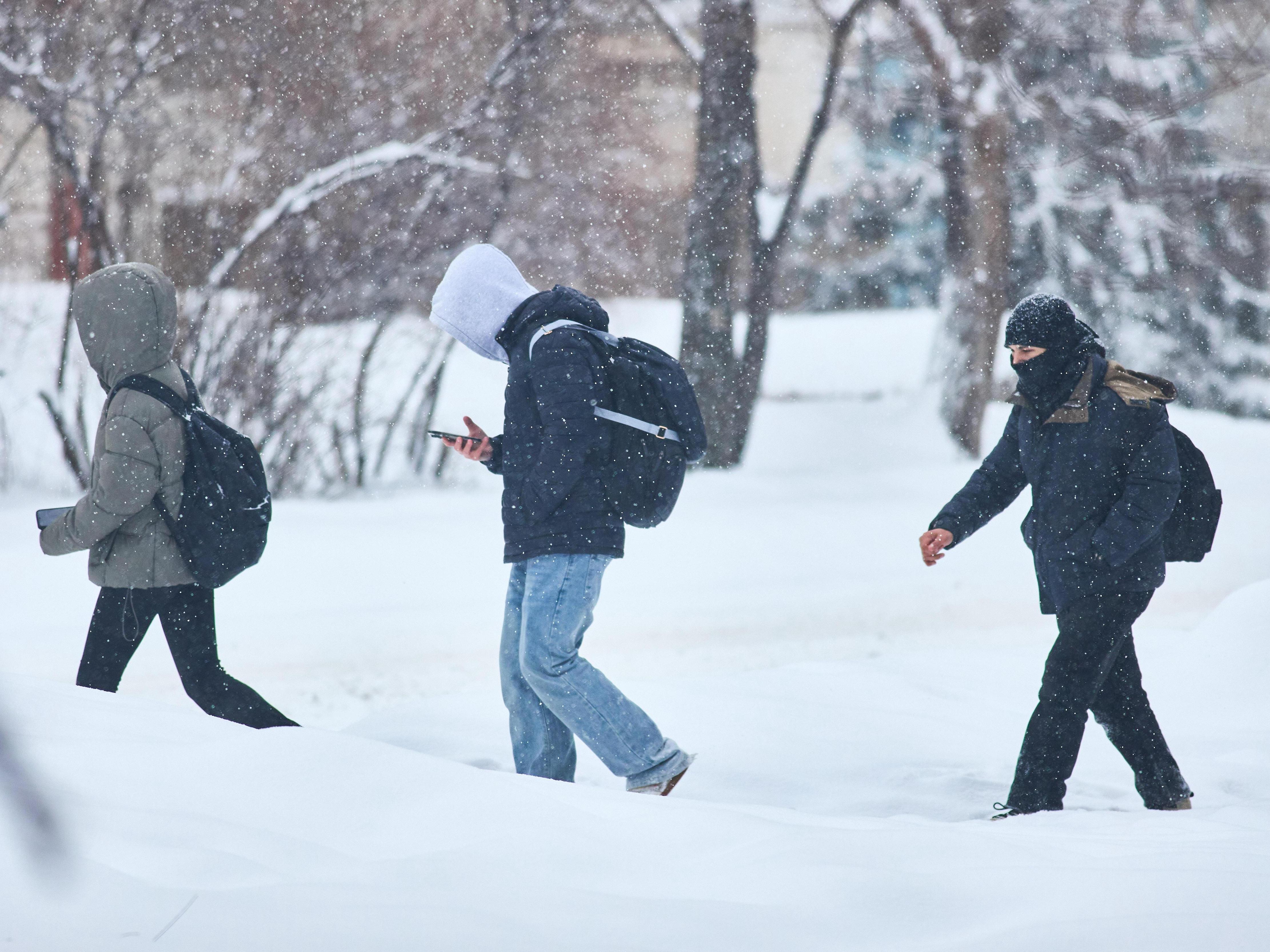 Workers walk together in a group through the heavy snow.