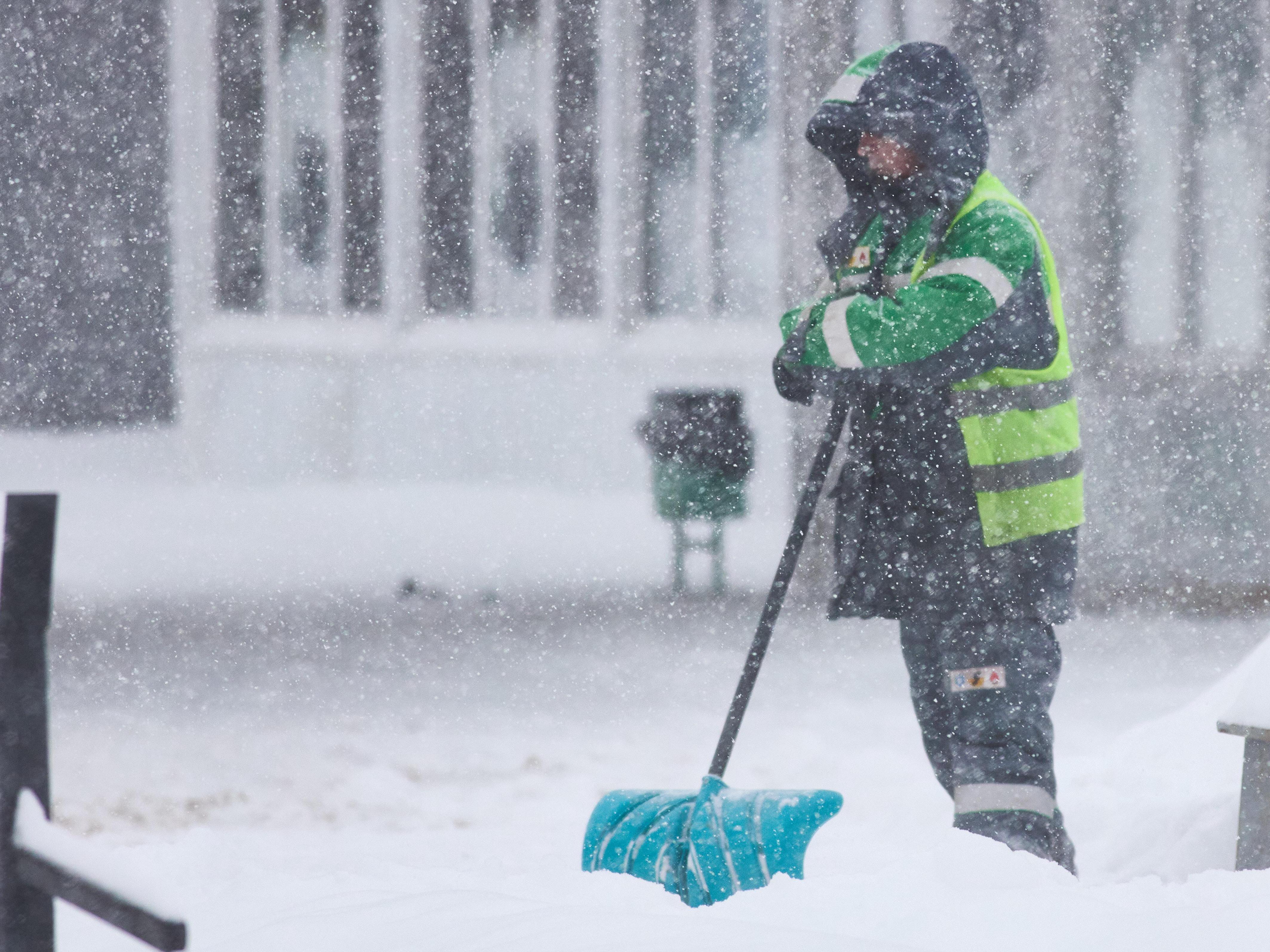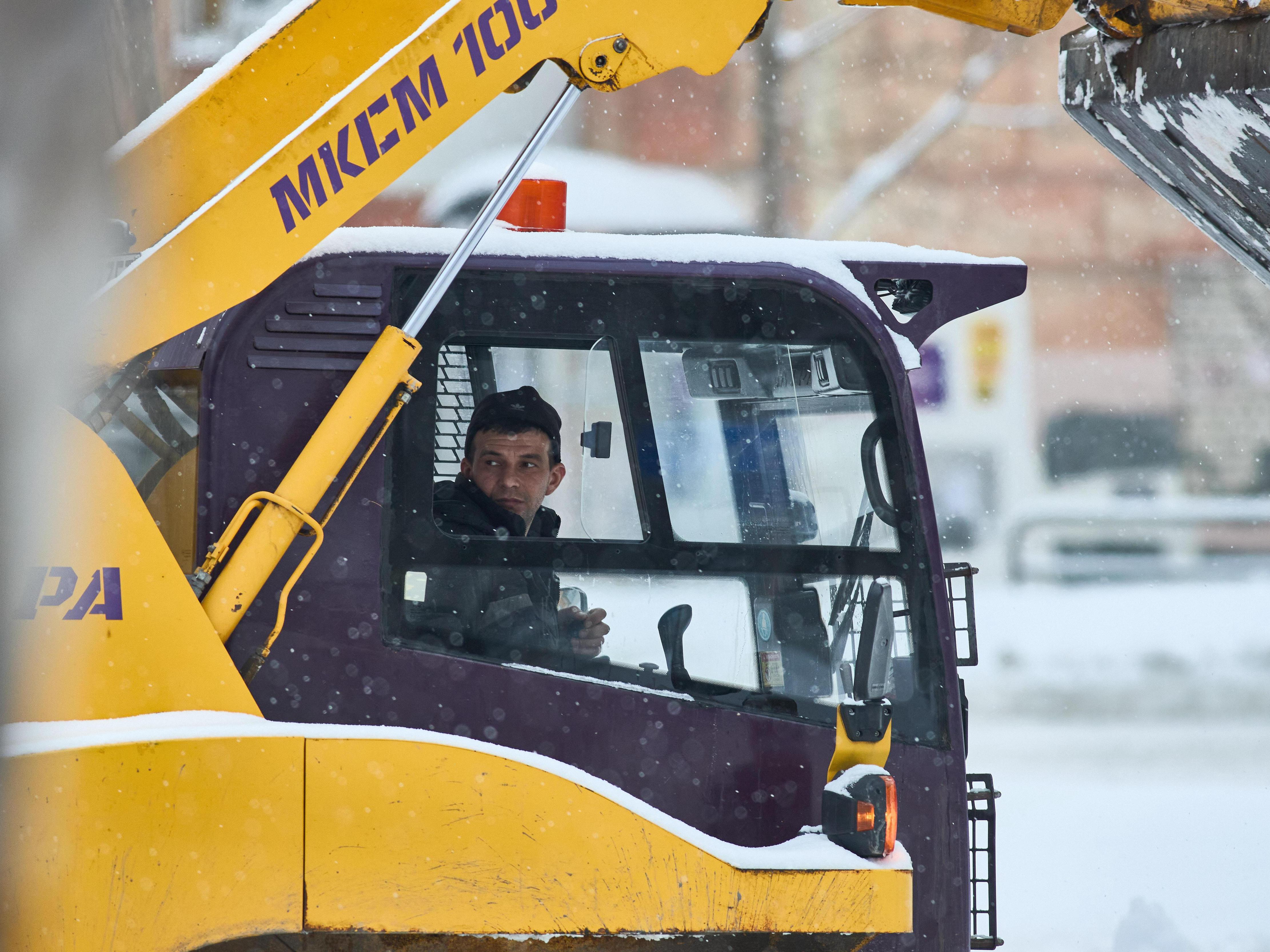 A worker gets ready to resume clearing snow after a rest.