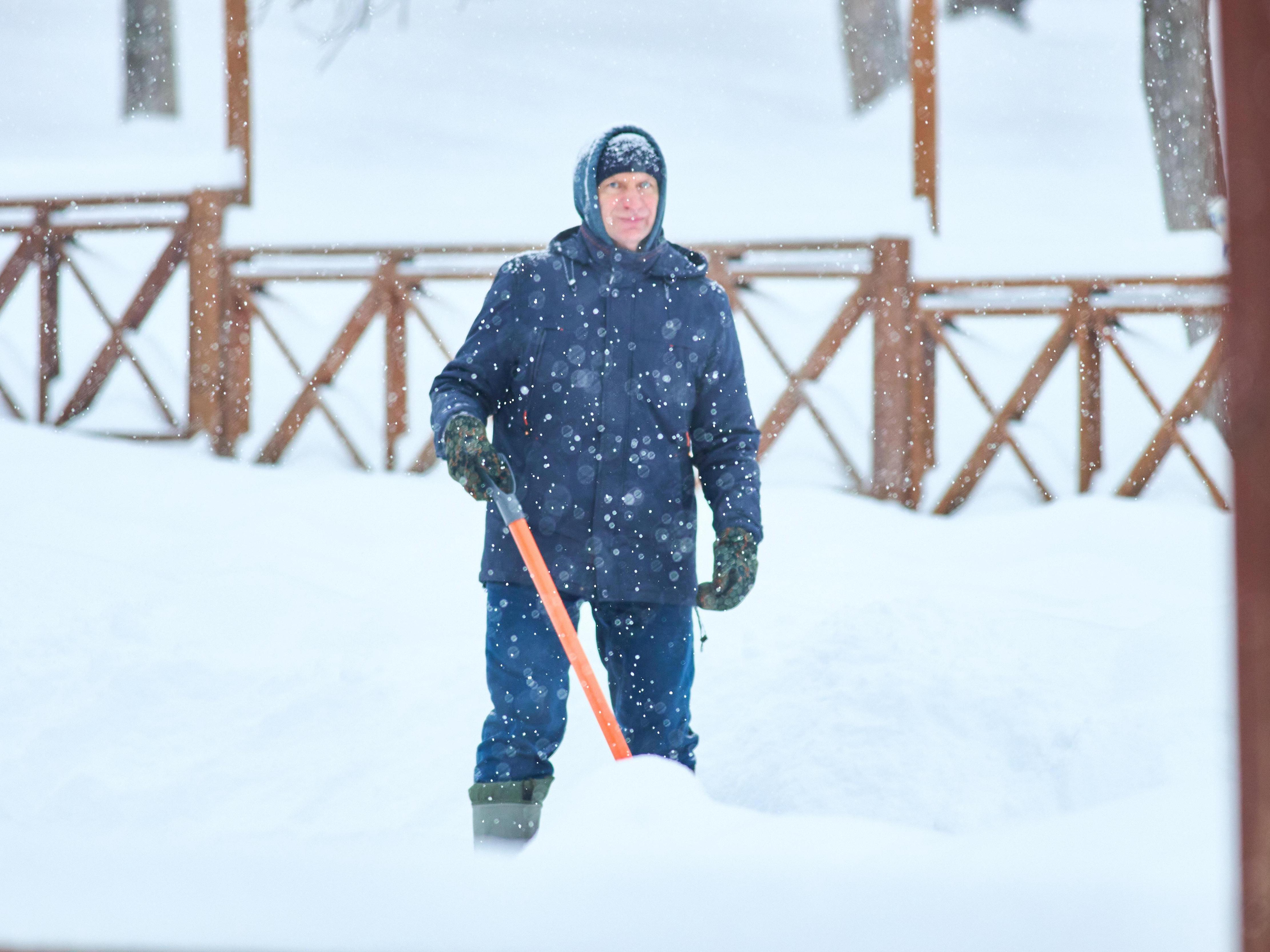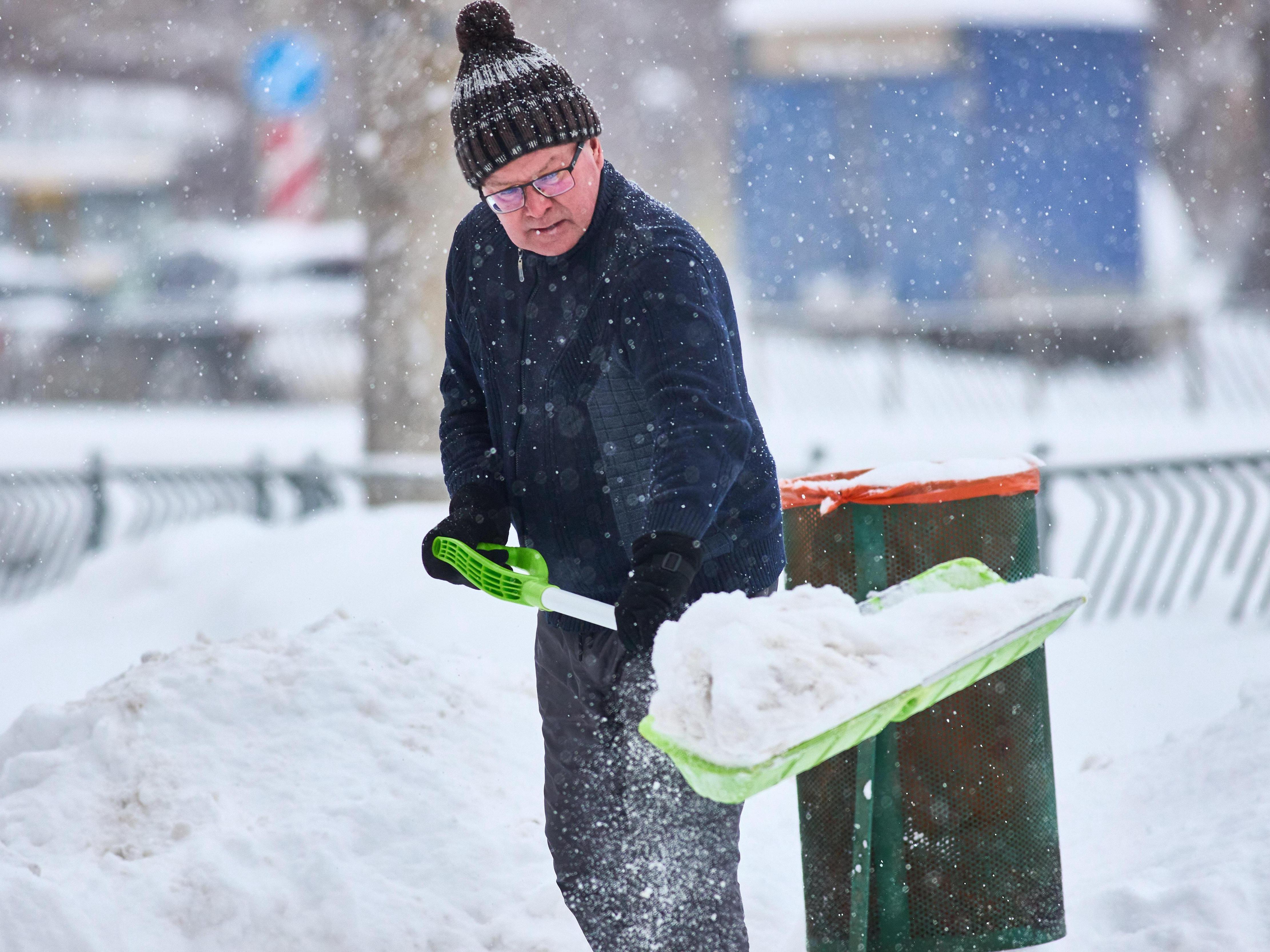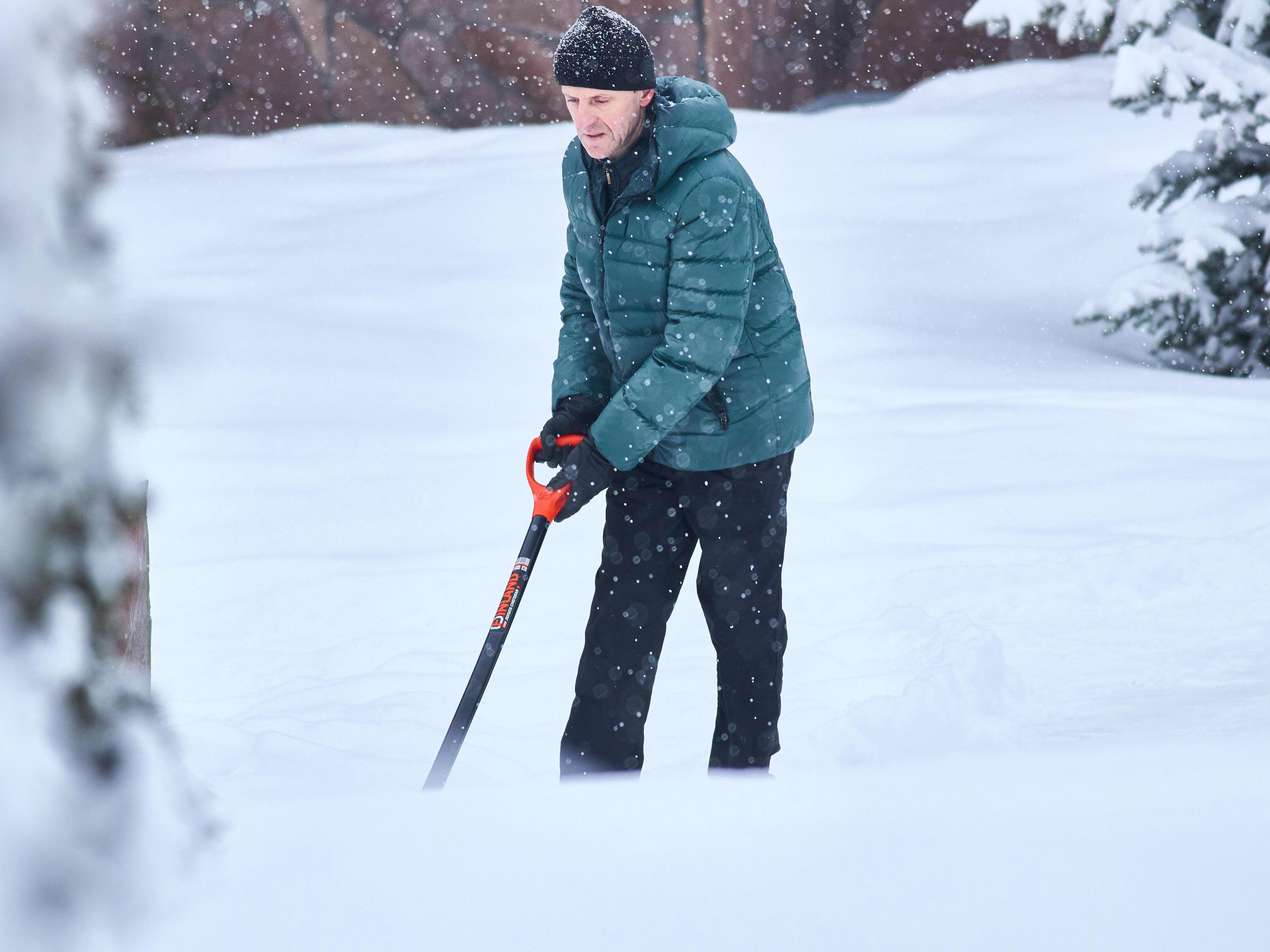 Shoveling snow provides a good cardiovascular workout for this worker.
